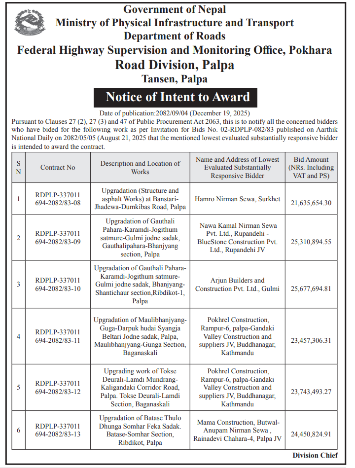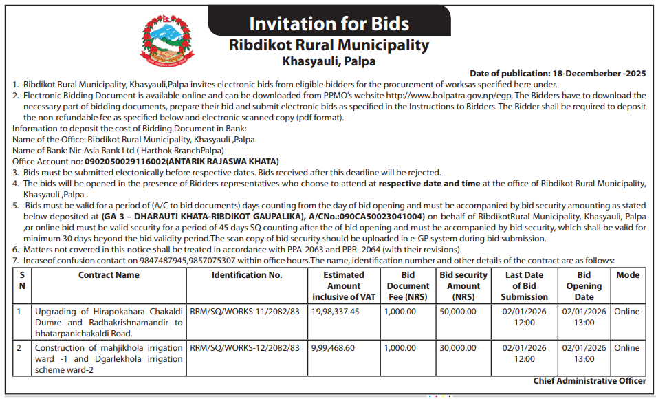 | 20 | Ribdikot Rural Municipality, Palpa | Upgrading of Hirapokahara Chakaldi Dumre and Radhakrishna mandir to bhatarpani chakaldi Road. | 18/12/2025 | PPMO | 02/01/2026 | Click Here | |