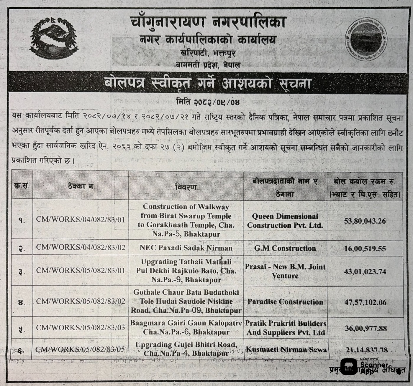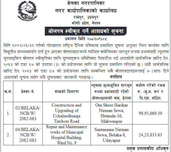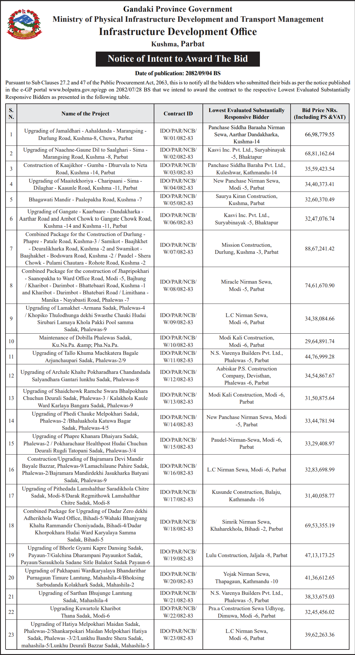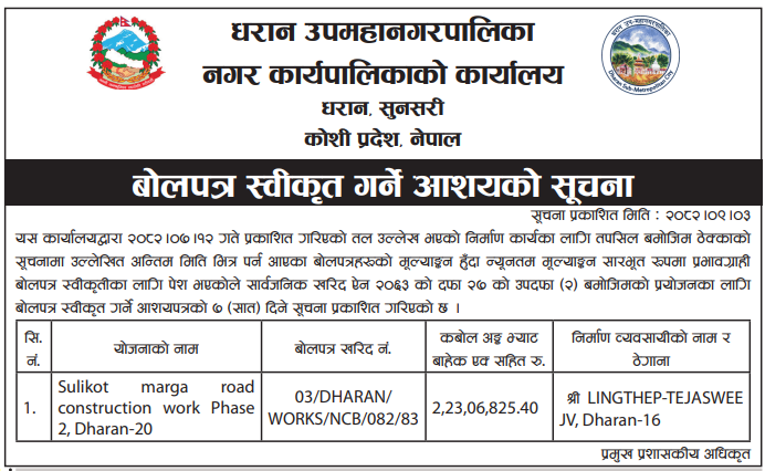 - Award Notice : Road Upgrading Work At Various Places (Swornikita Construction and Suppliers, Gatishil-Gravity JV) |