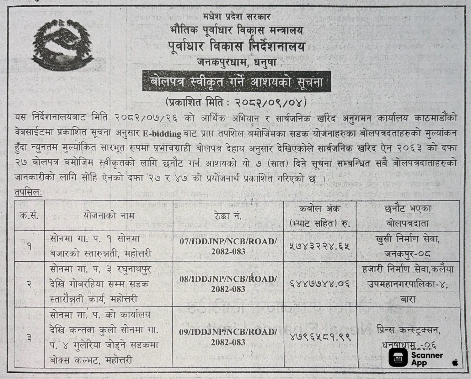 प्रदेश ३ मा प्रकाशित निर्माण सम्बन्धी बोलपत्र तथा आशयका सुचनाहरु