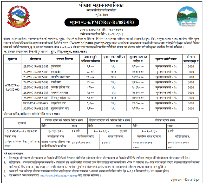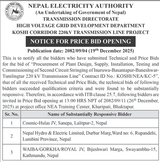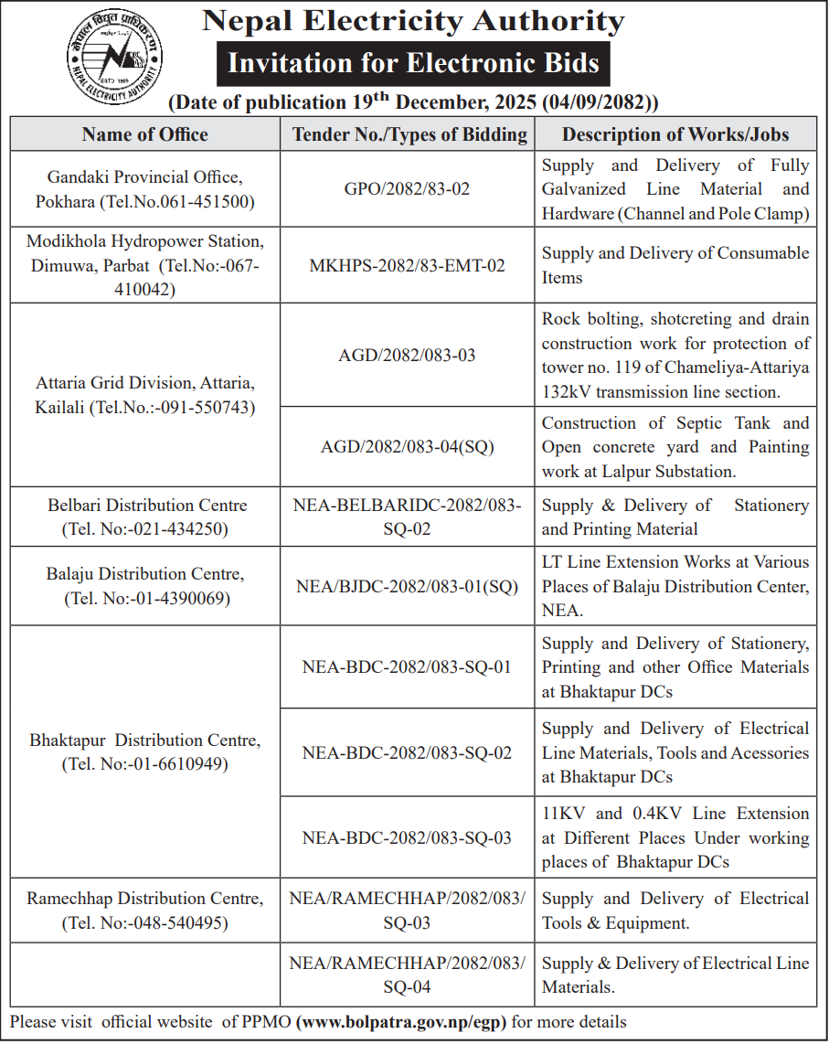 | 16 | NEA, Pokhara Distribution Center | LT Line extension & Reinforcement works at various places of Pokhara DCS | 18/12/2025 | PPMO | 02/01/2026 | Click Here | |