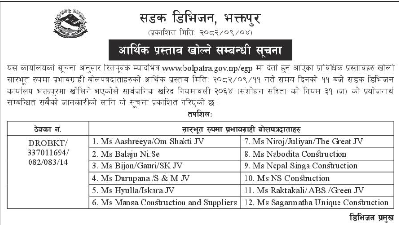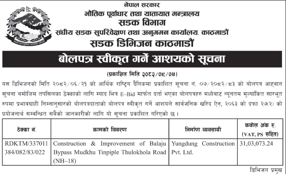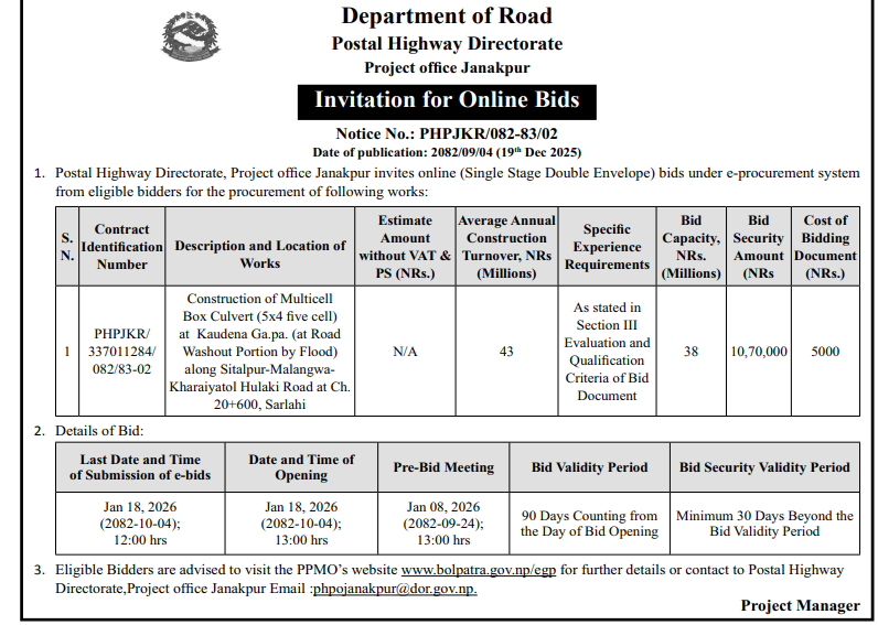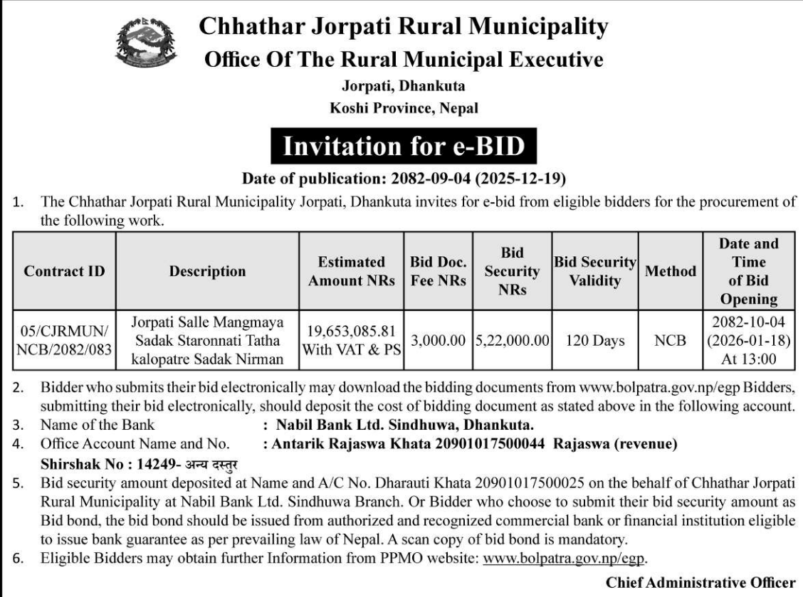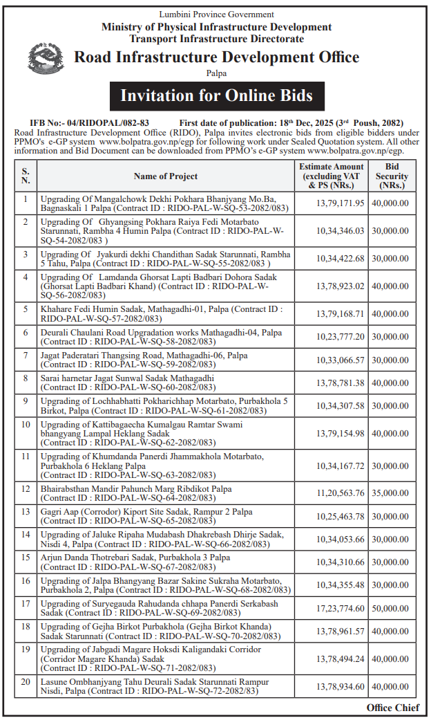 | 180 | Road Infrastructure Development Office, Palpa | Upgrading of Jalpa Bhangyang Bazar Sakine Sukraha Motarbato, Purbakhola 2 Palpa | 18/12/2025 | PPMO | 02/01/2026 | Click Here | |