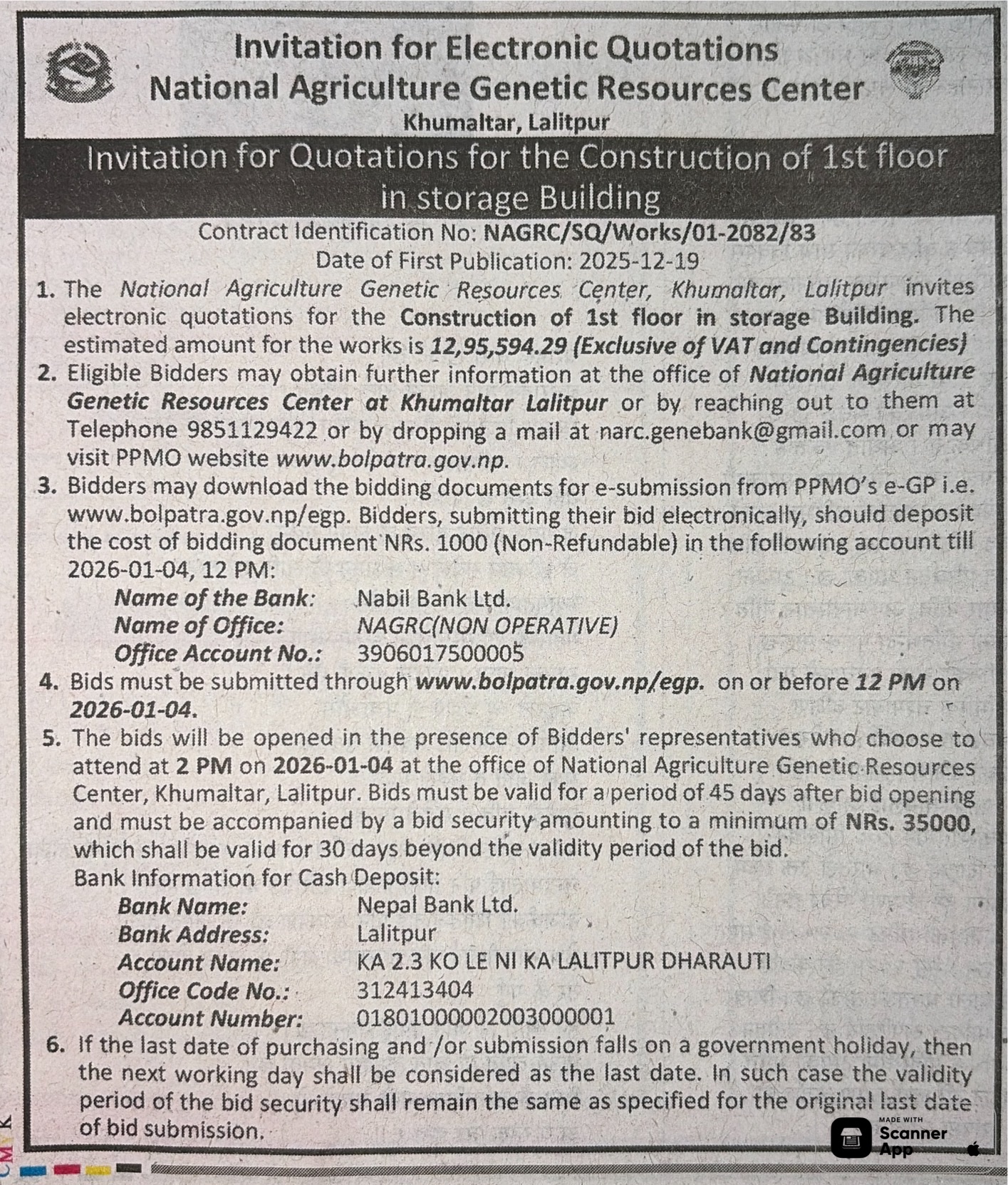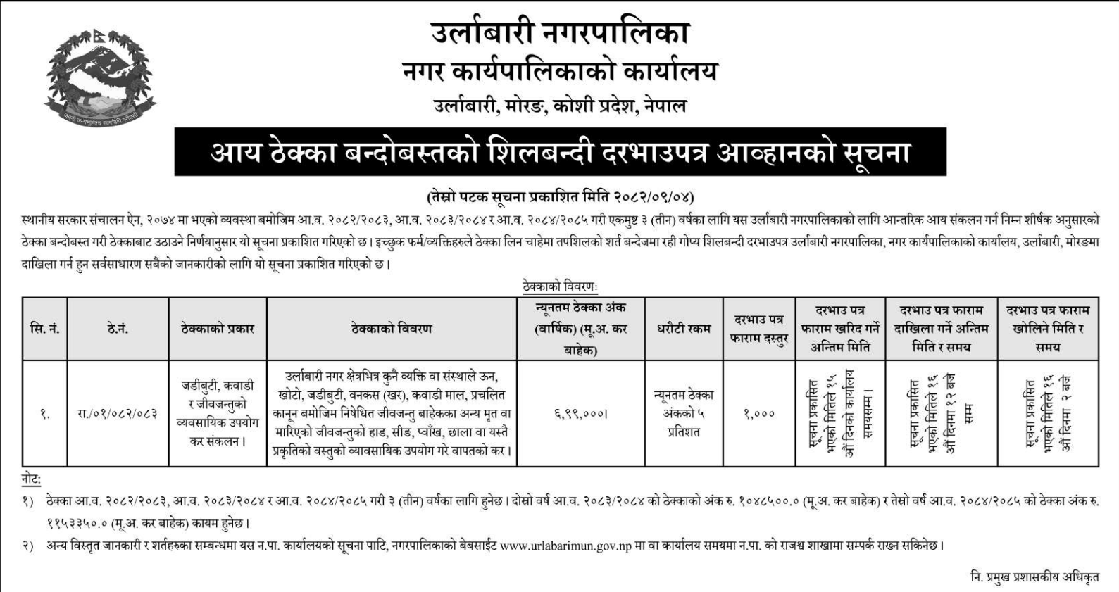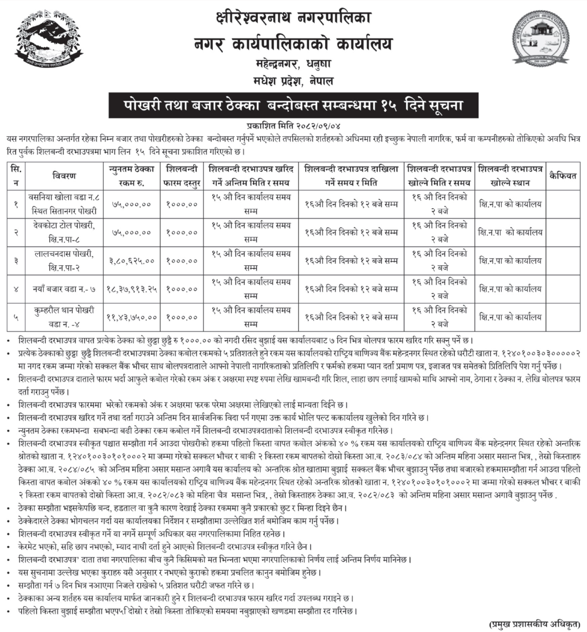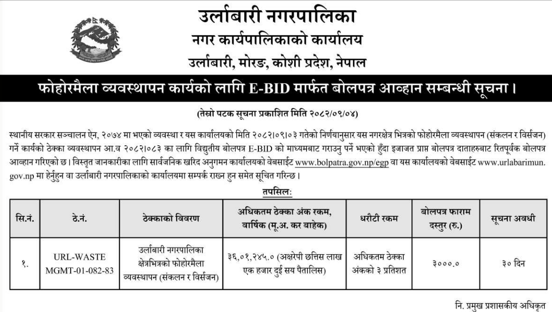 | 52 | Siddharthanagar Municipality Office, Lumbini Province, RUPANDEHI; | Supply of stationary and other necessary goods at siddharthanagar municipality | 18/12/2025 | PPMO | 18/01/2026 | Click Here | |
