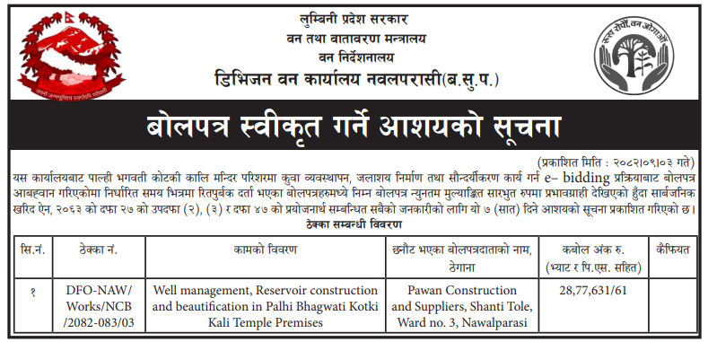 | 51 | Parsa National Park, Adhabhar Bara | Hatti ko dana Supply | 18/12/2025 | PPMO | 18/01/2026 | Click Here | |