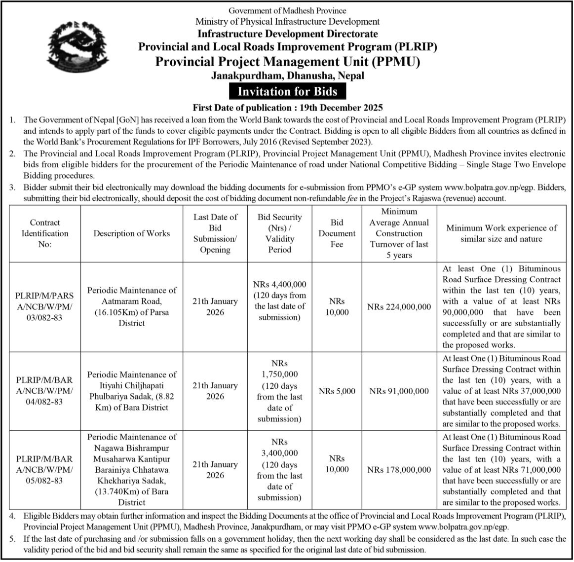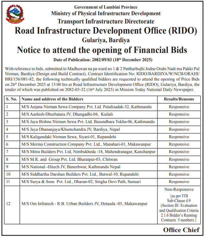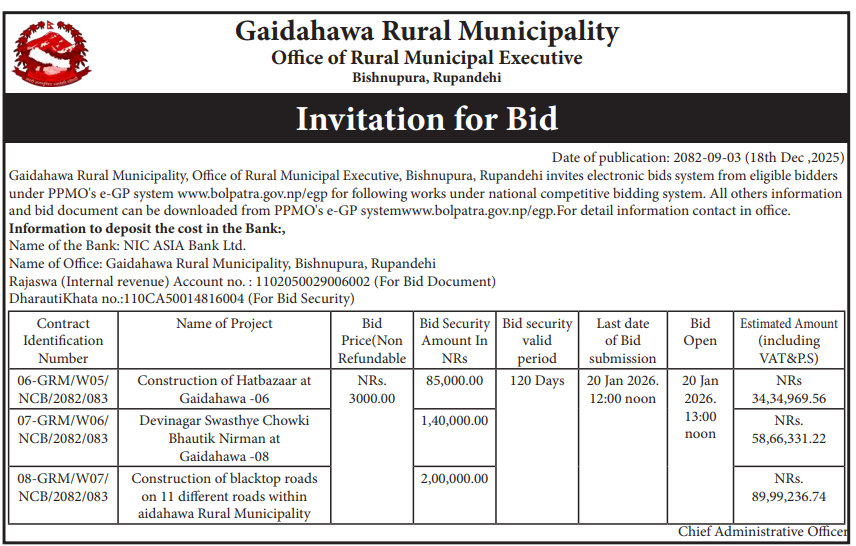 | 154 | Road Infrastructure Development Office, Kapilvastu | Bairiya Rajpur Nandanagar Sadak Starunati Banganga -1 ra 2, Kapilvastu, Kapilvastu Chhetra No. 1(1) | 18/12/2025 | PPMO | 02/01/2026 | Click Here | |