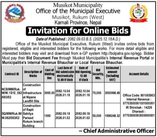 | 25 | Office of the Musikot Municipal Executive, Rukum (West) | Construction of Rapti Sahitya Parisad Rukum branch Building | 18/12/2025 | PPMO | 02/01/2026 | Click Here | |