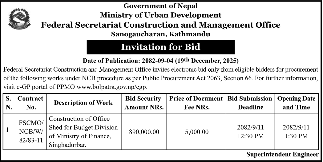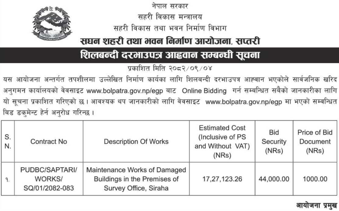 | 138 | Urban Development and Building Office, Makawanpur | RCC works at Nijanda Dham Park Hetauda Sub Metropolitian City Ward No 8, Makawanpur | 18/12/2025 | PPMO | 18/01/2026 | Click Here | |