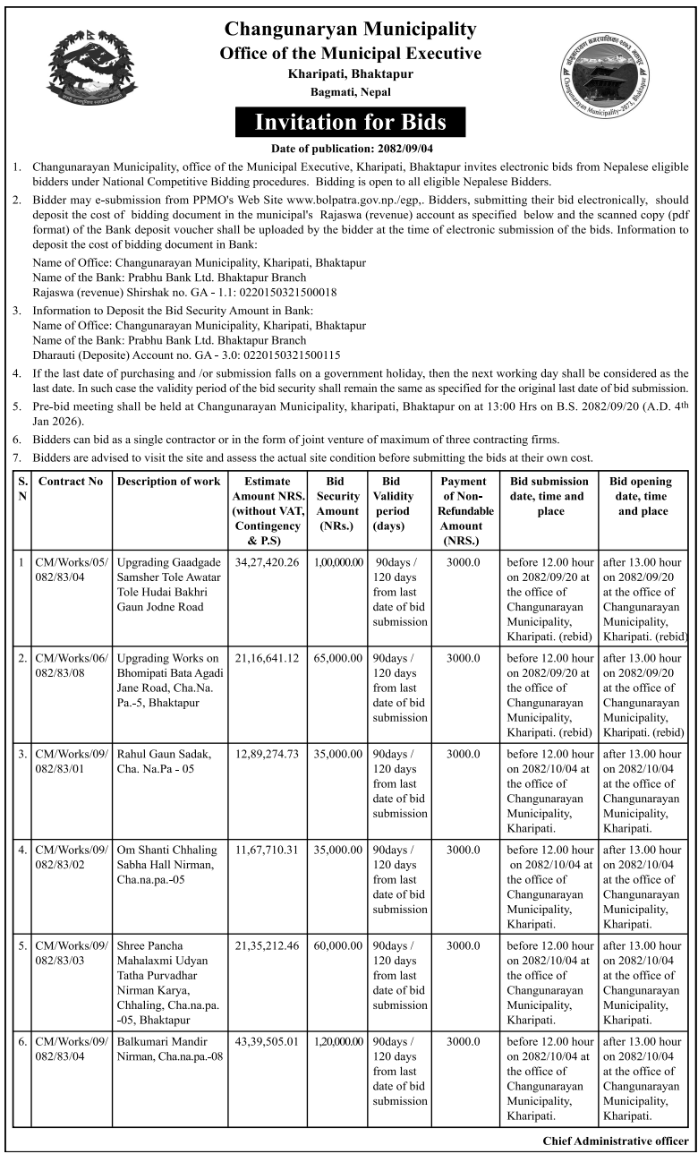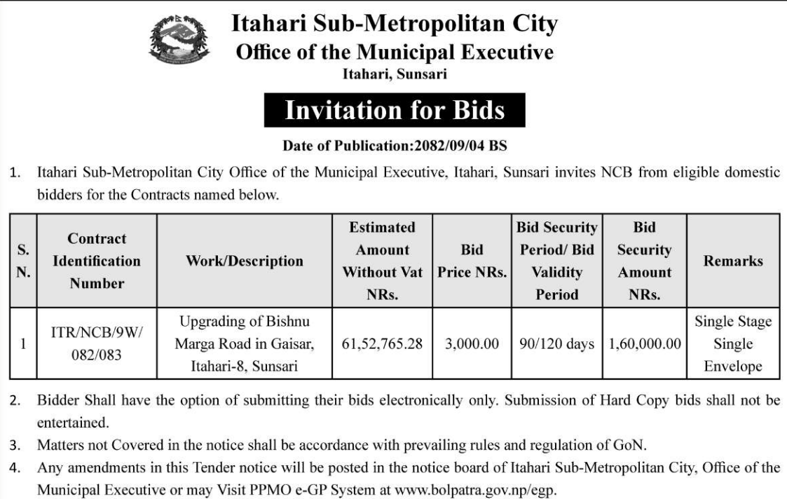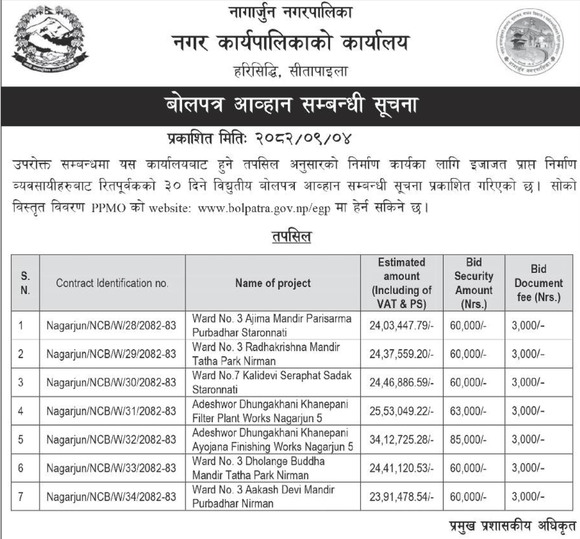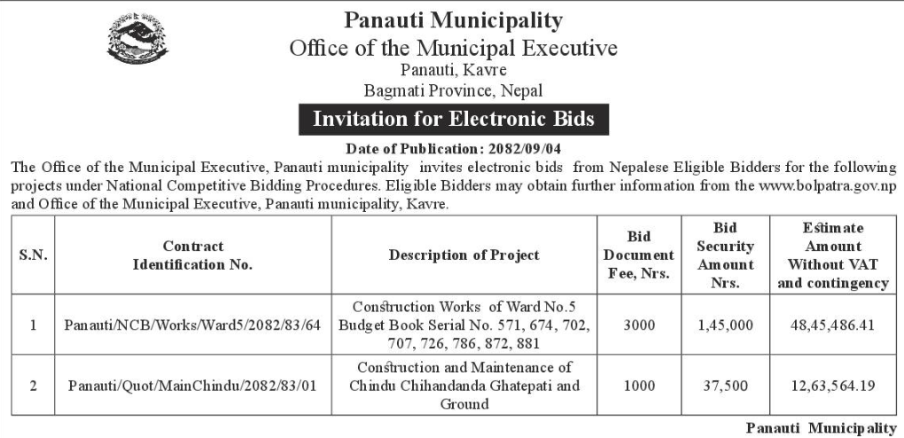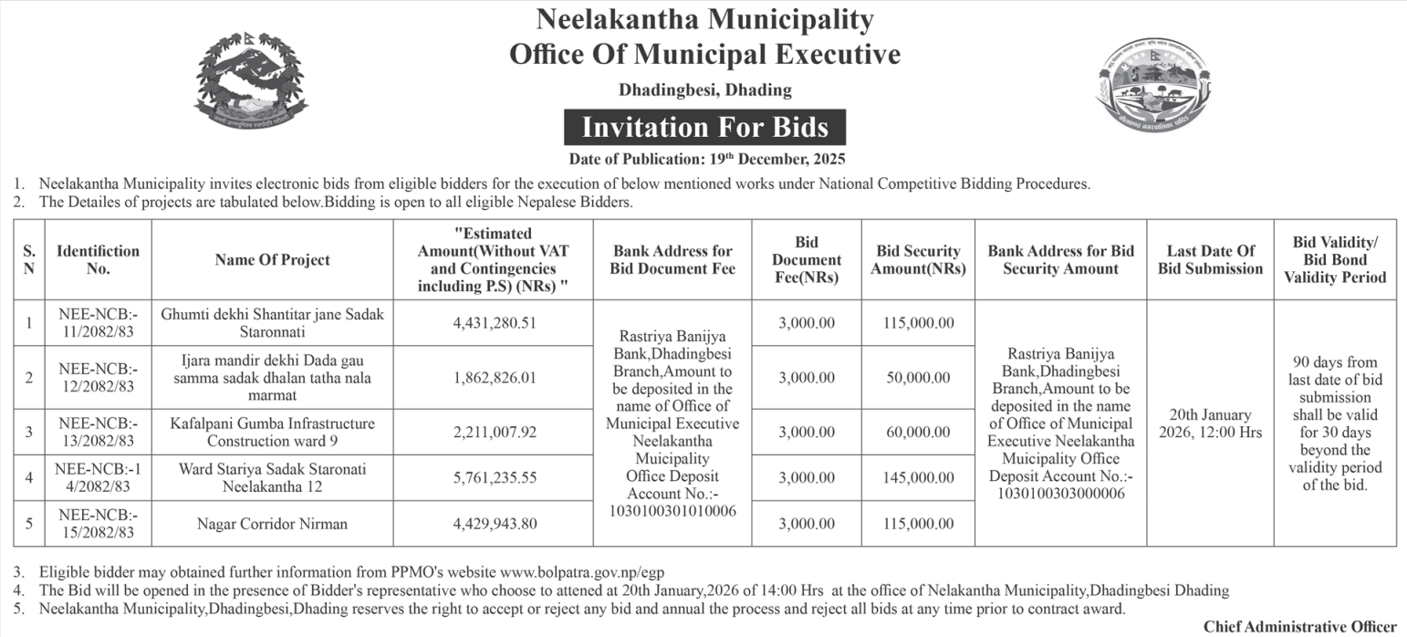 | 133 | Tarakeshwor Municipality Office, Bagmati Province, KATHMANDU; | Construction works of woda num 9 ra 10 ko simana dekhi mathi indrayani pul hudae thapa pul samma Corridor nirman (sangle khola corridor) | 18/12/2025 | PPMO | 18/01/2026 | Click Here | |