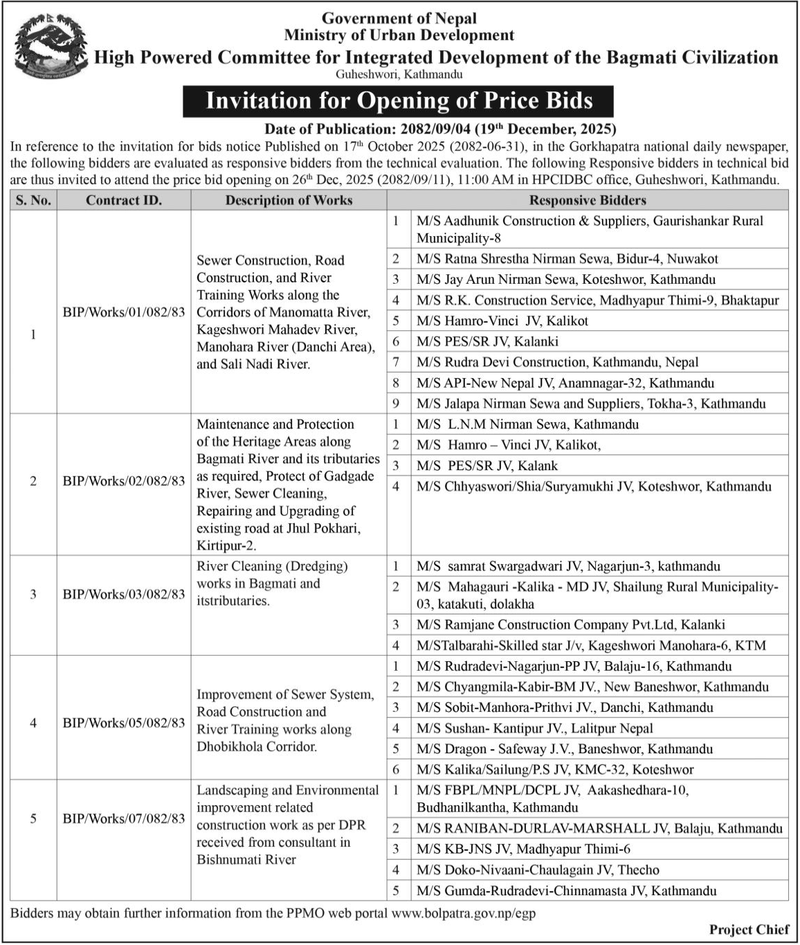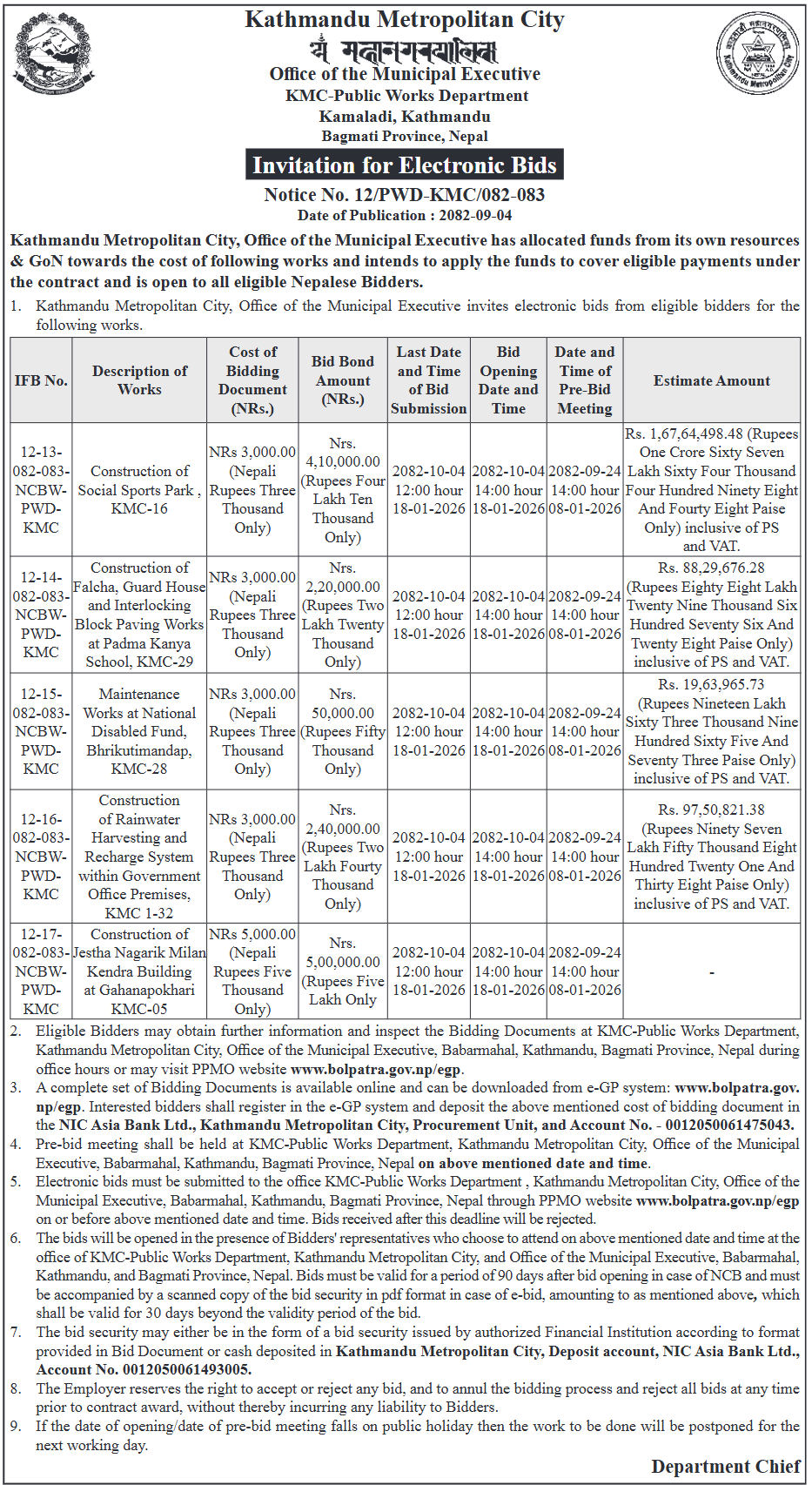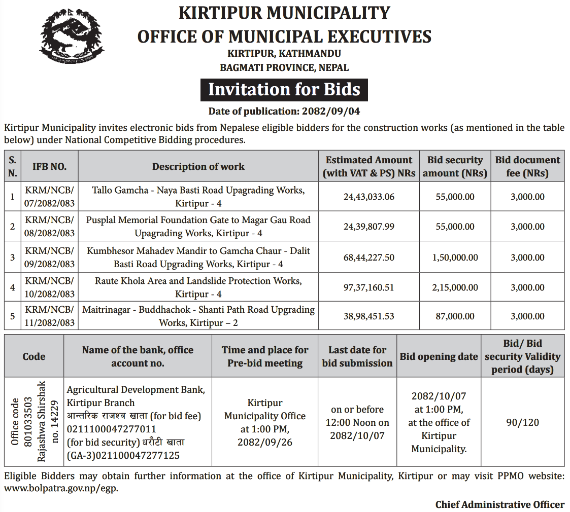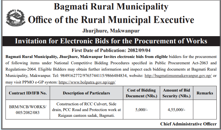 | 133 | Tarakeshwor Municipality Office, Bagmati Province, KATHMANDU; | Construction works of woda num 9 ra 10 ko simana dekhi mathi indrayani pul hudae thapa pul samma Corridor nirman (sangle khola corridor) | 18/12/2025 | PPMO | 18/01/2026 | Click Here | |