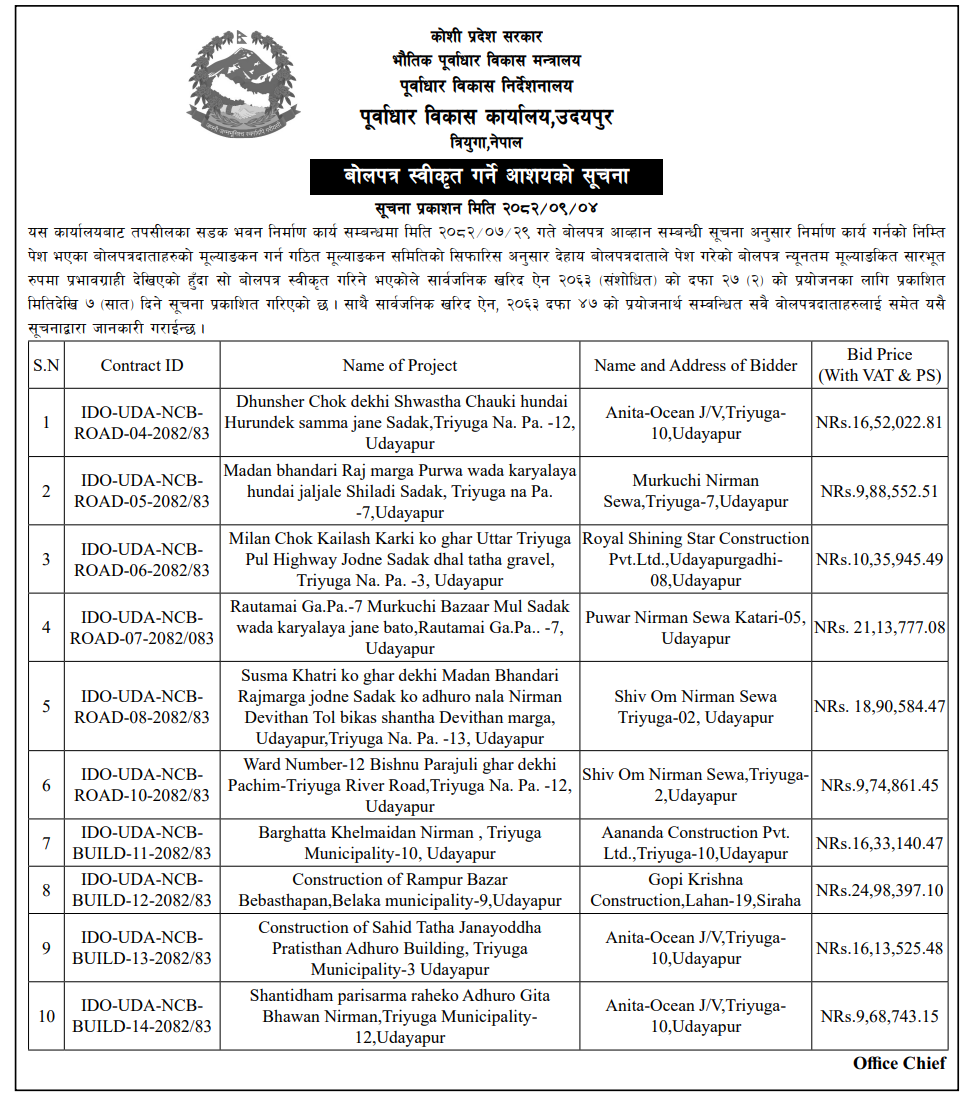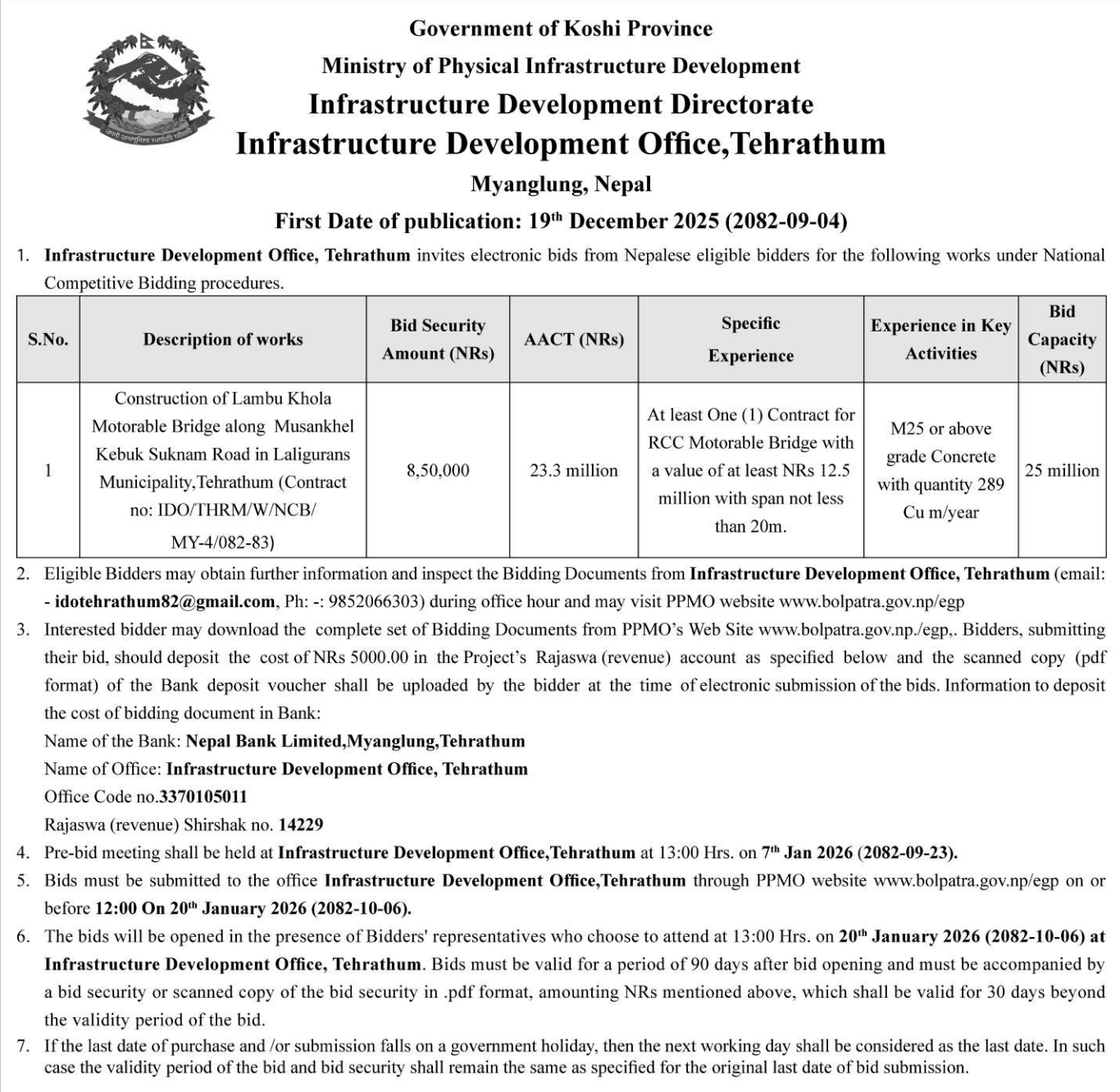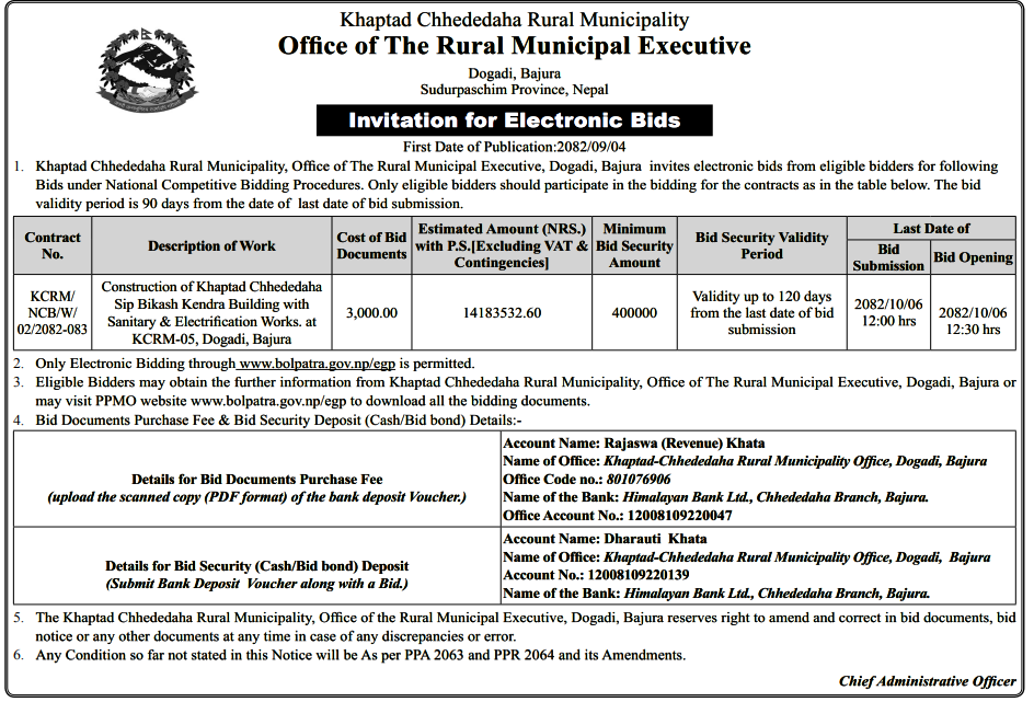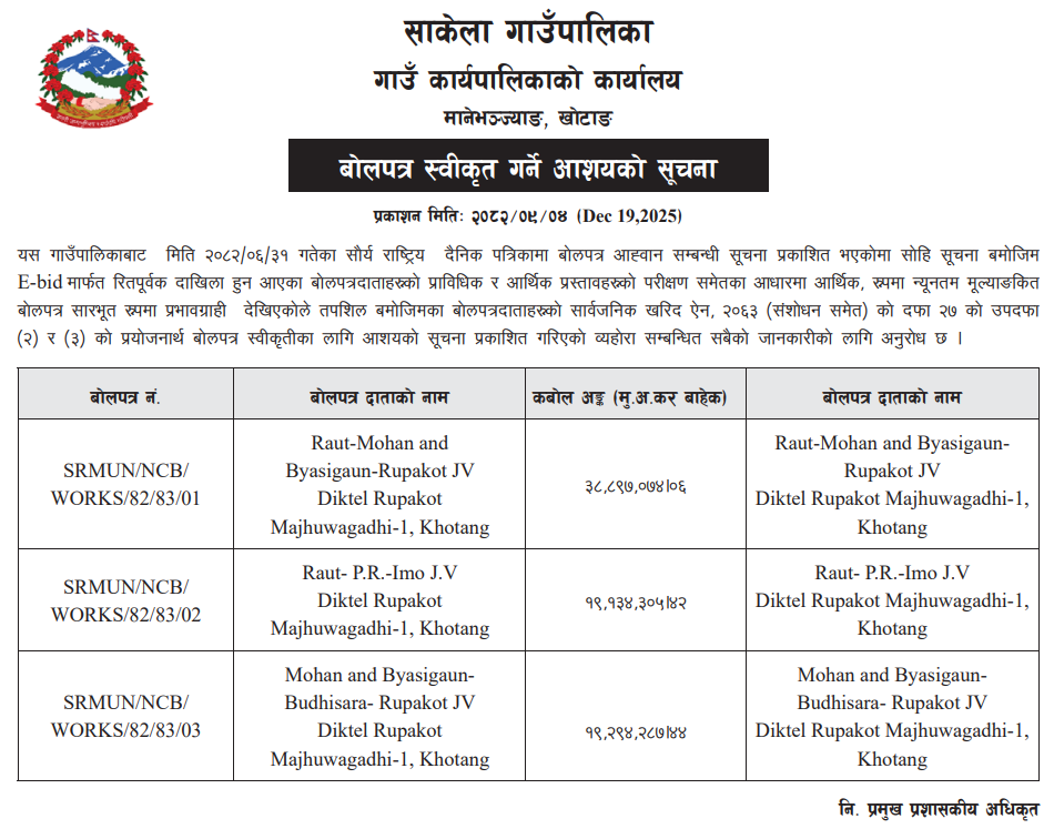 | 2 | Infrastructure Development Office, Khotang | Patkar Sumde sadak nirman, Kepilasgadhi-1, Khotang | 18/12/2025 | PPMO | 02/01/2026 | Click Here | |