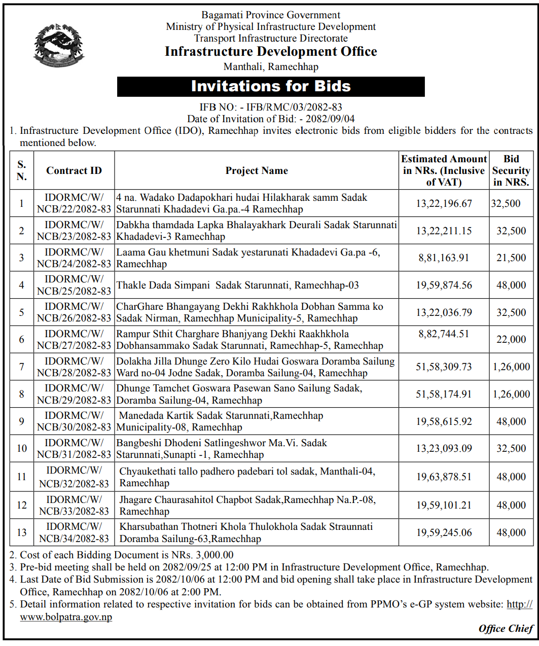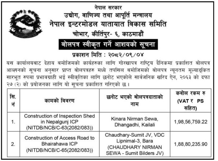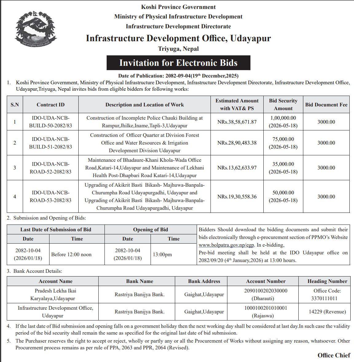 | 2 | Infrastructure Development Office, Khotang | Patkar Sumde sadak nirman, Kepilasgadhi-1, Khotang | 18/12/2025 | PPMO | 02/01/2026 | Click Here | |