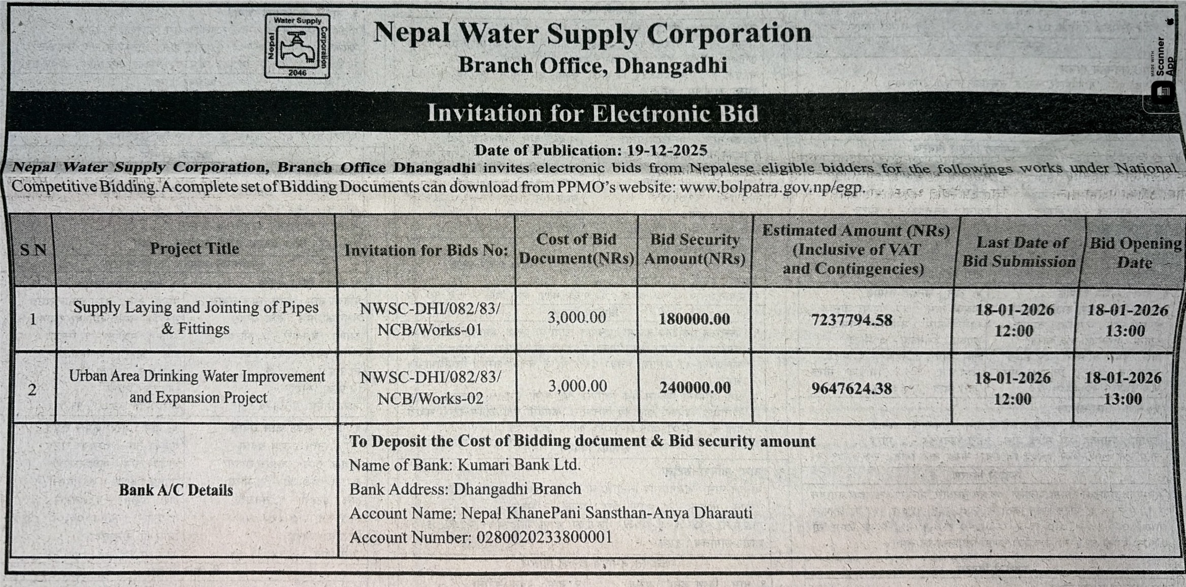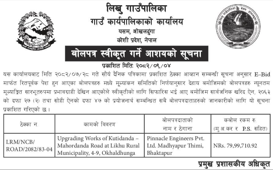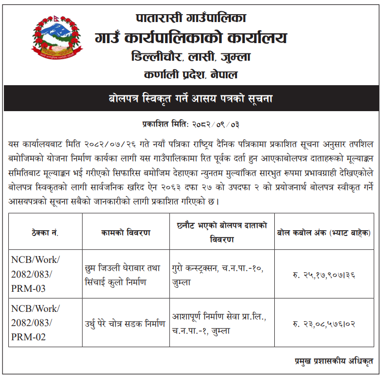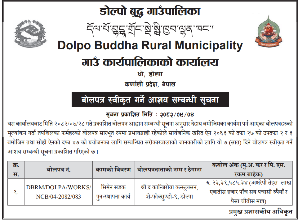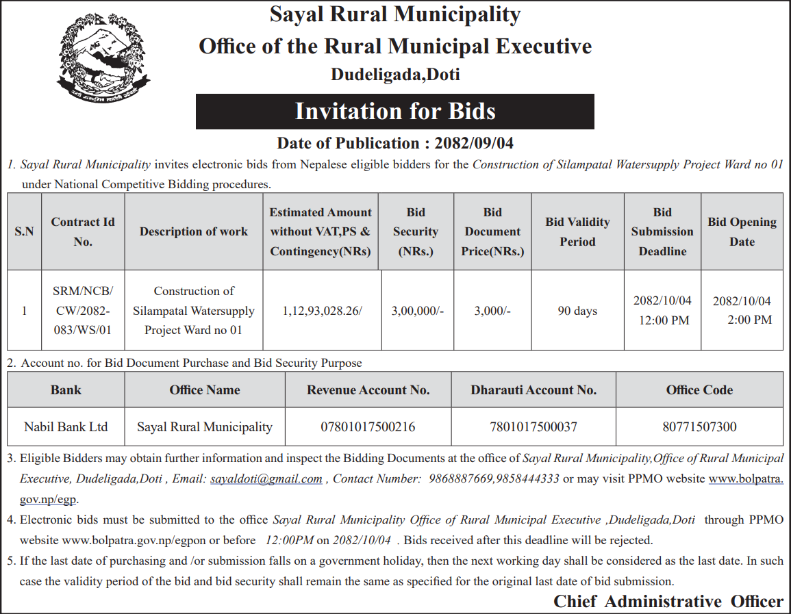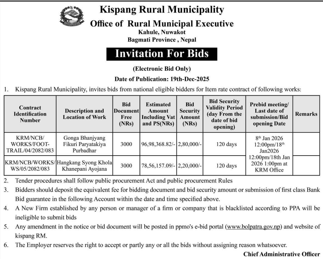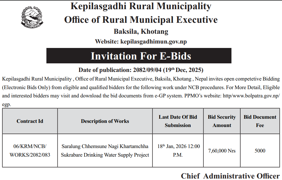 | 8 | Kumakh Rural Municipality,Salyan | Constructions of Tikachaur Sichai Kulo Nirman Kumakh 4 Salyan | 18/12/2025 | PPMO | 02/01/2026 | Click Here | |