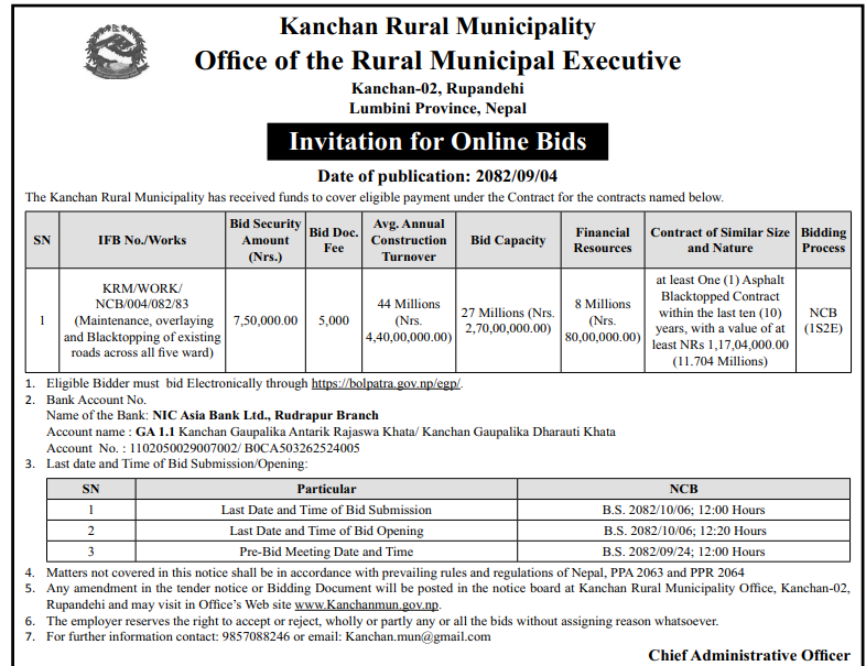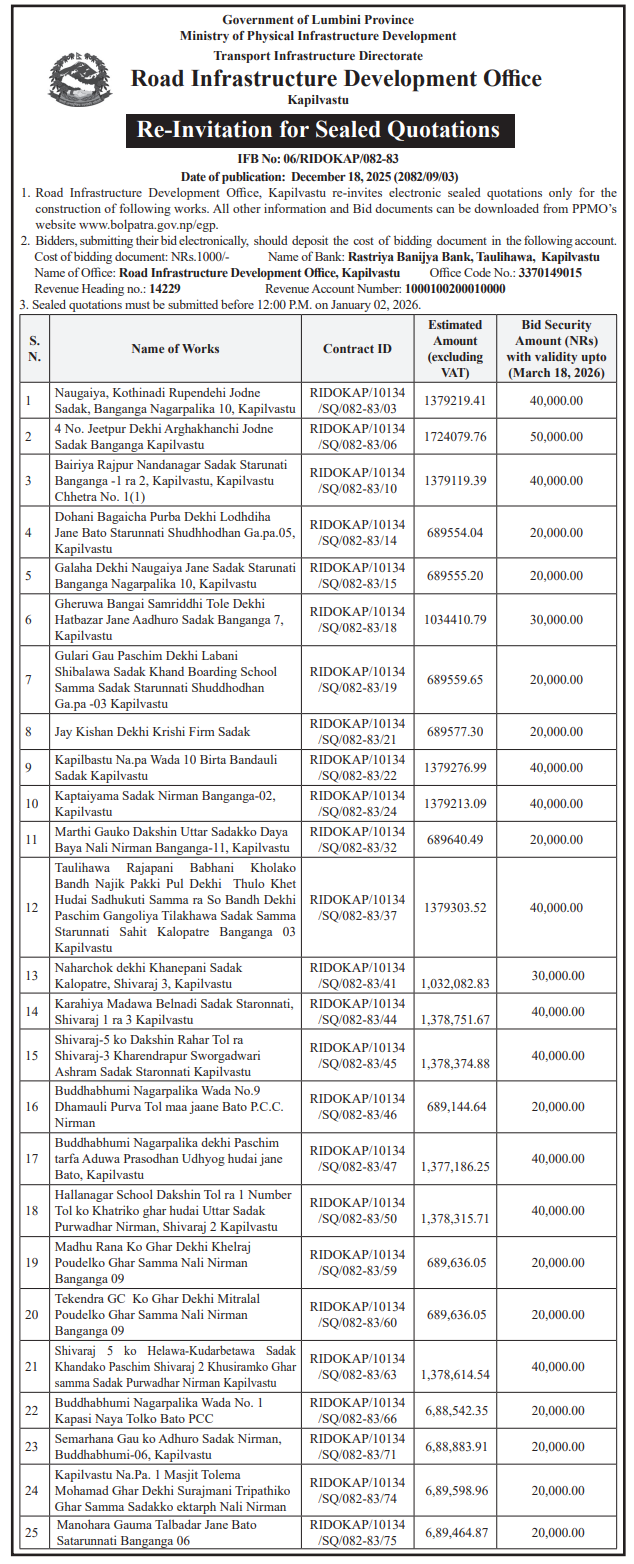 | 152 | Road Infrastructure Development Office, Kapilvastu | Naugaiya, Kothinadi Rupendehi Jodne Sadak, Banganga Nagarpalika 10, Kapilvastu | 18/12/2025 | PPMO | 02/01/2026 | Click Here | |