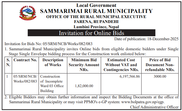 | 150 | Chhatradev Rural Municipality | Ratapokhara Khel Maidan Maintenace Works | 18/12/2025 | PPMO | 07/01/2026 | Click Here | |