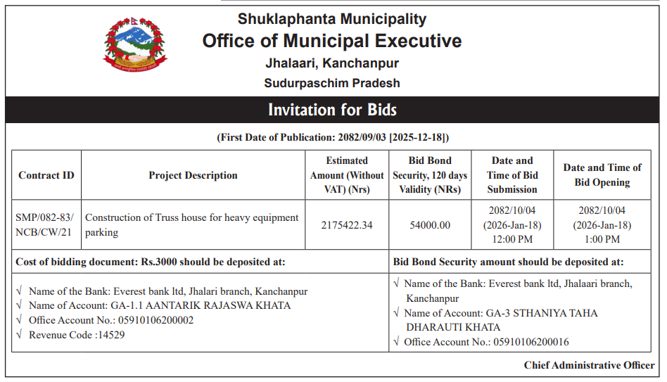 | 130 | Shuklaphanta Municipality, Kanchanpur | Construction of Truss house for heavy equipment Parking | 18/12/2025 | PPMO | 18/01/2026 | Click Here | |