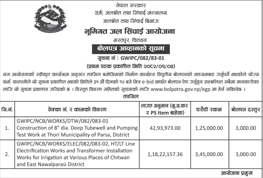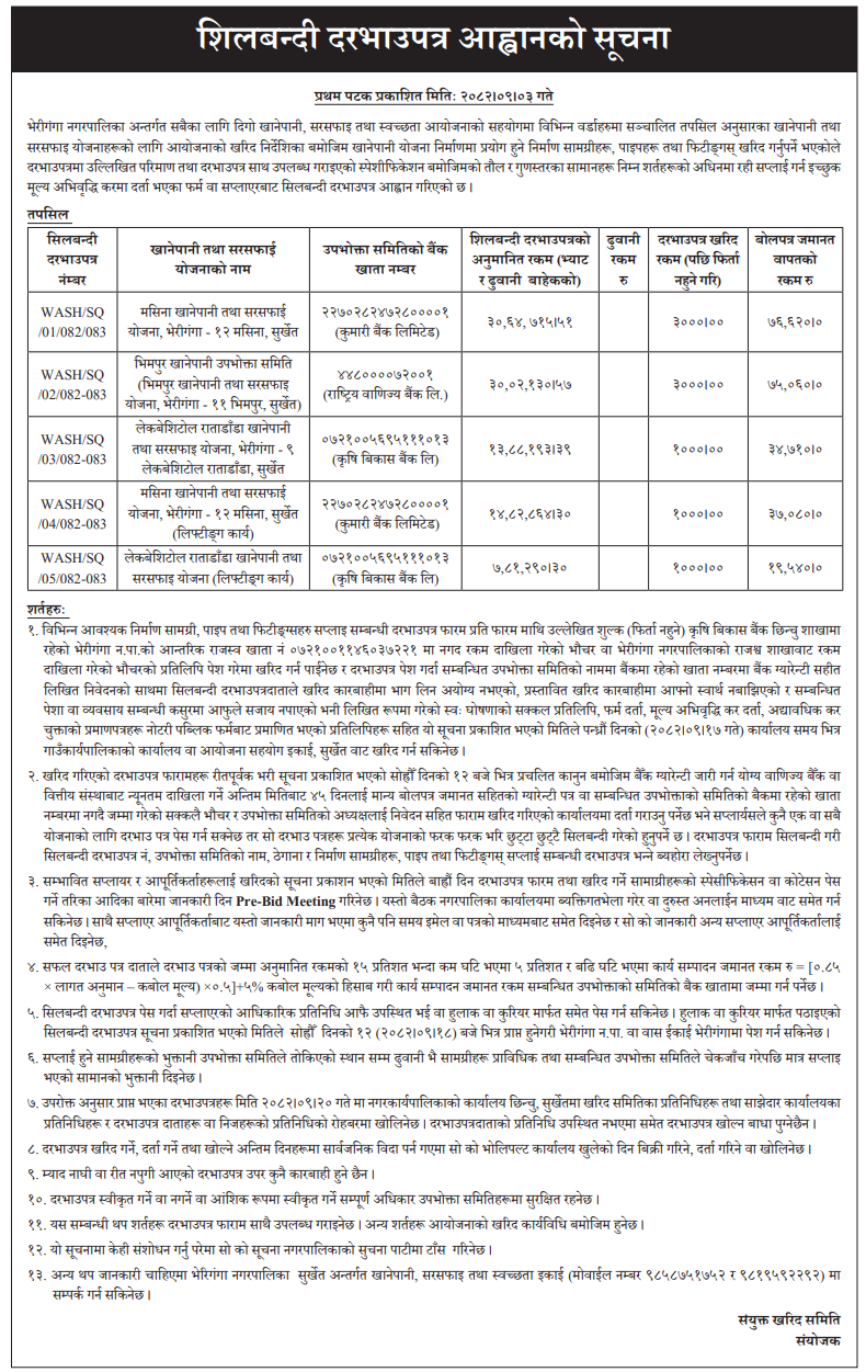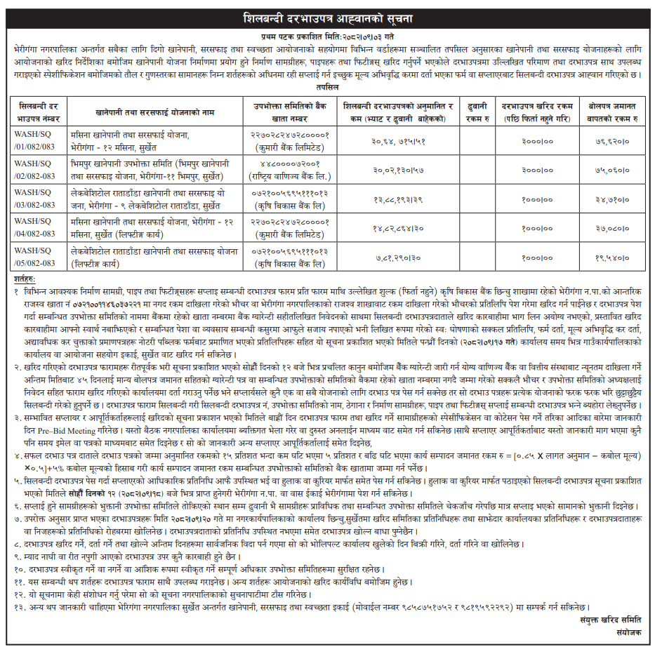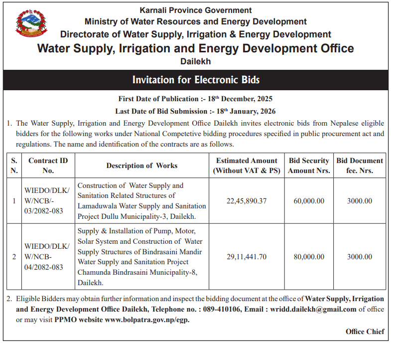 | 145 | Water Supply, Irrigation & Energy Development Office, Dailekh | Supply & Installation of Pump, Motor, Solar System and Construction of Water Supply Structures of Bindrasaini Mandir Water Supply and Sanitation Project Chamunda Bindrasaini Municipality-8, Dailekh. | 18/12/2025 | PPMO | 18/01/2026 | Click Here | |