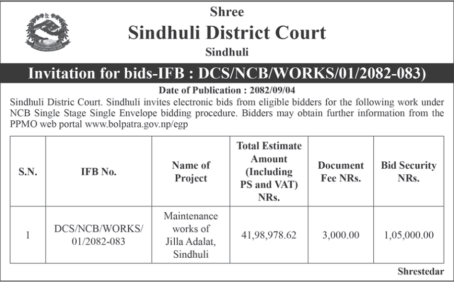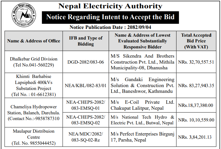 | 18 | NEA, Pokhara Grid Division | Civil Maintenance Works at Raang Khola Substation. | 18/12/2025 | PPMO | 02/01/2026 | Click Here | |