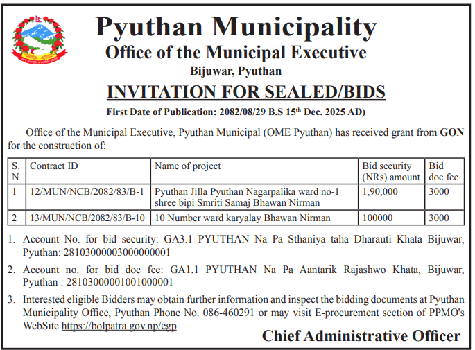 | 197 | Gaumukhi Rural Municipality Office, Lumbini Province, PYUTHAN; | Construction Of Gyanoday Aa.Vi School Building. | 18/12/2025 | PPMO | 02/01/2026 | Click Here | |