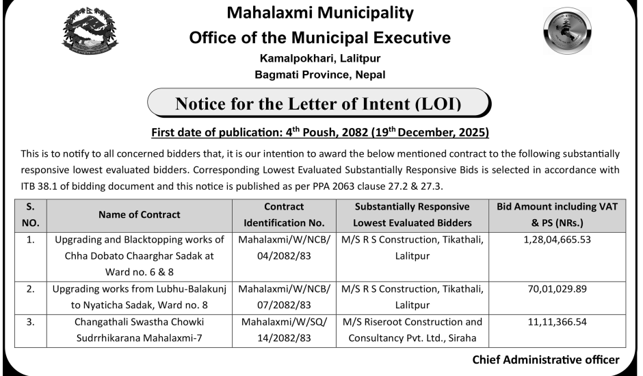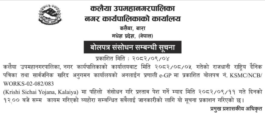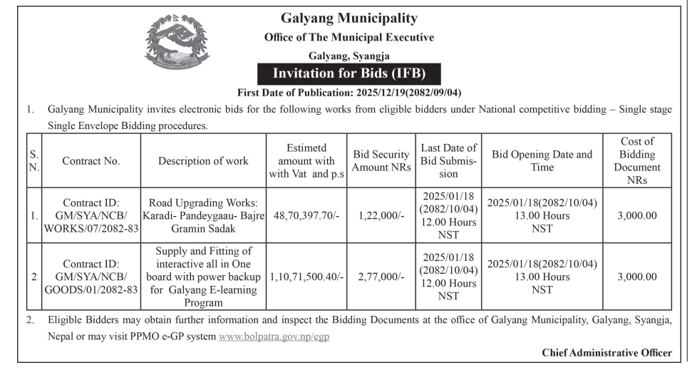 | 46 | Lahan Municipality | Supplying and Delivery of Smart board and Cctv works. | 18/12/2025 | PPMO | 18/01/2026 | Click Here | |