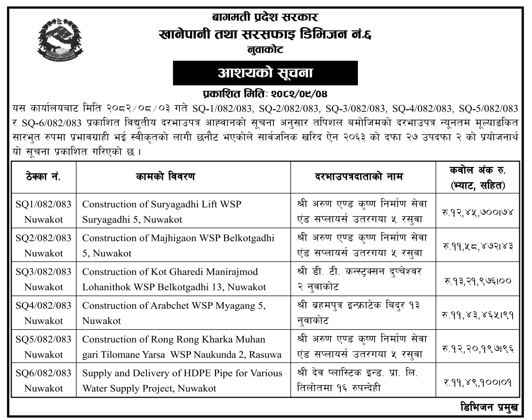 प्रदेश ७ मा प्रकाशित निर्माण सम्बन्धी बोलपत्र तथा आशयका सुचनाहरु