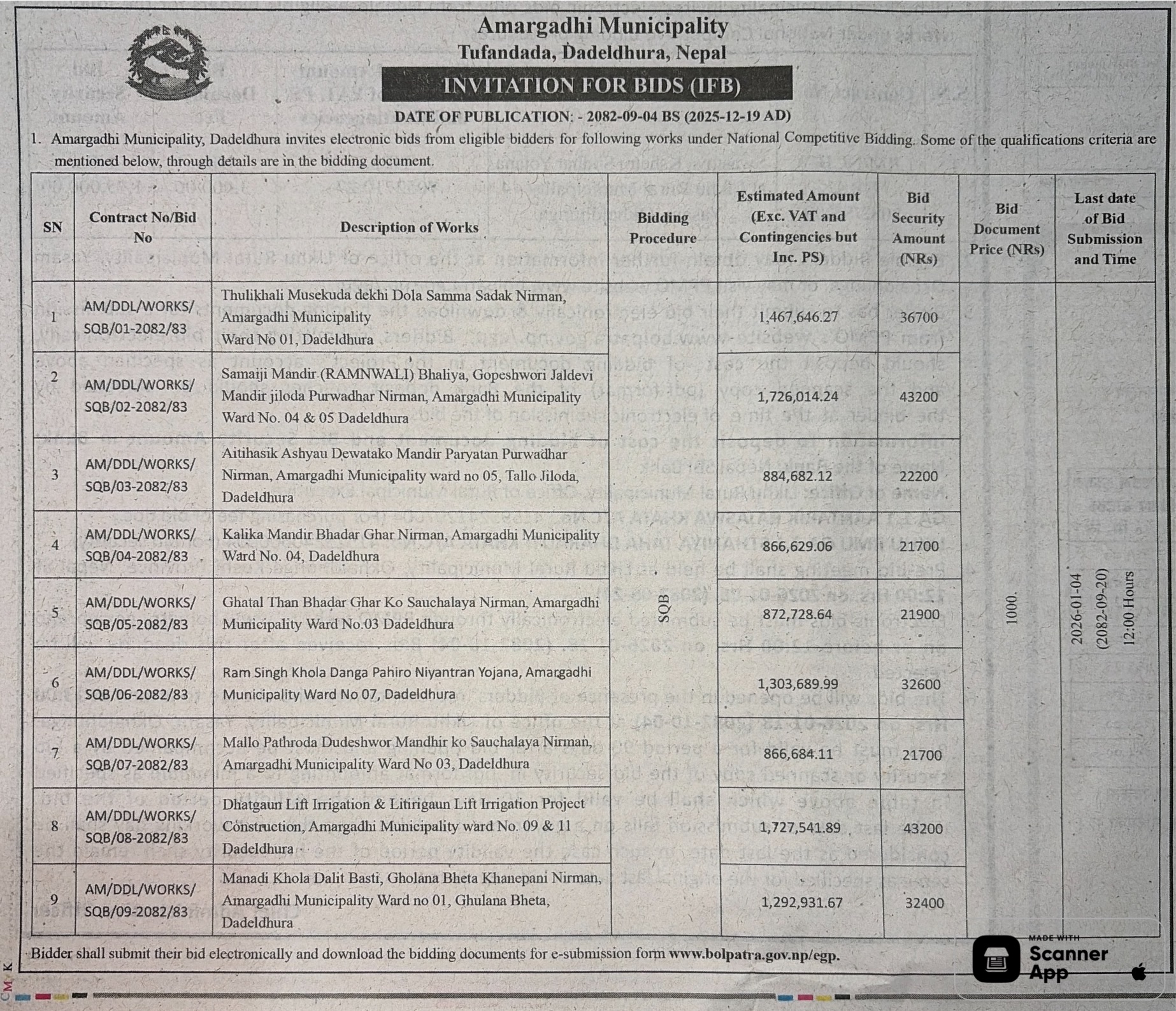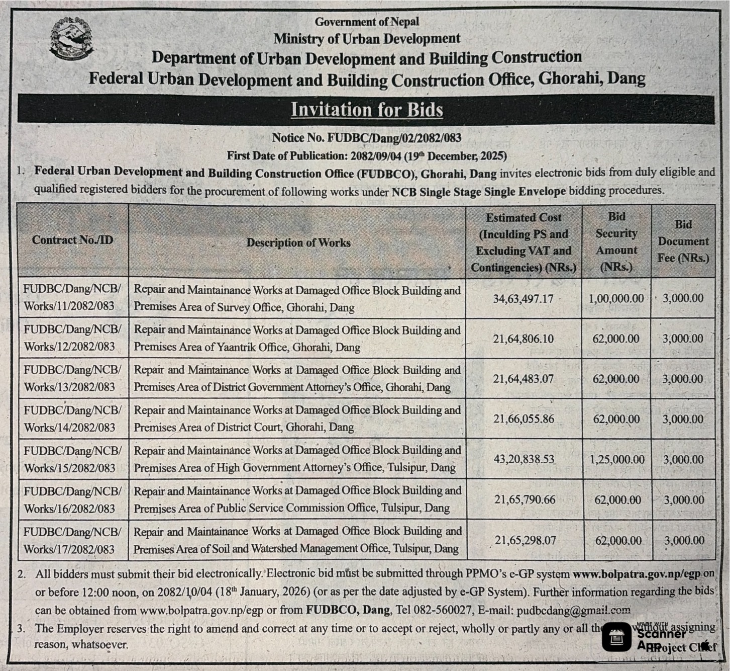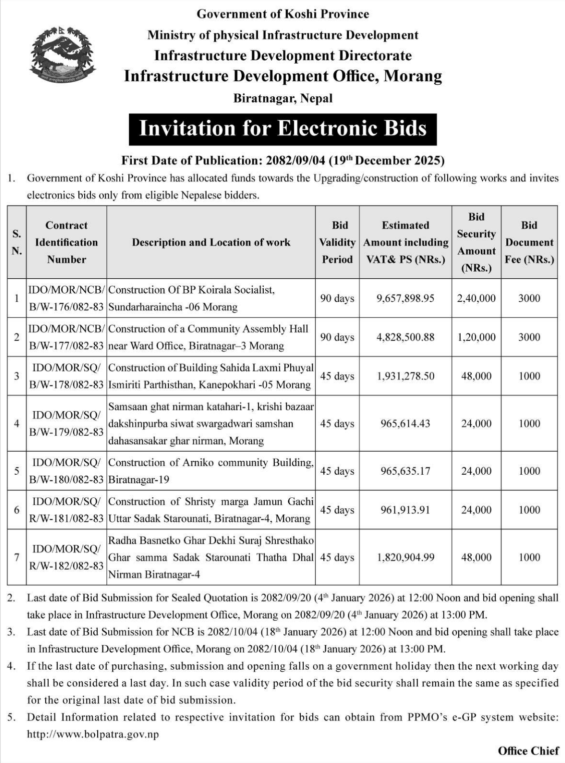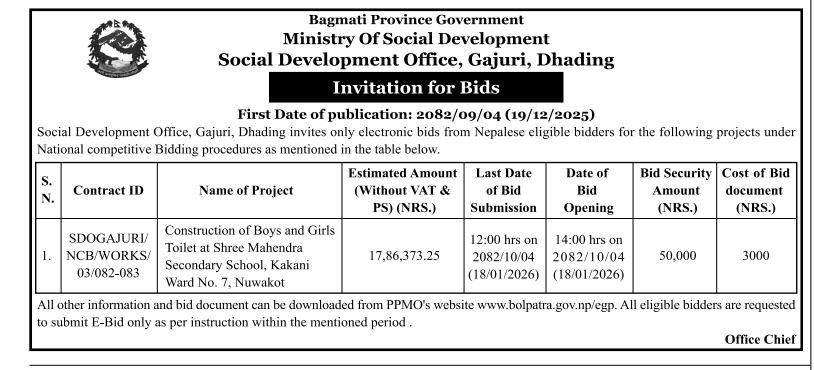 | 124 | Jhapa Rural Municipality Office, Koshi Province, JHAPA; | Construction of 4 room 2 Storey Mahendra Ma.bi School Building | 18/12/2025 | PPMO | 18/01/2026 | Click Here | |