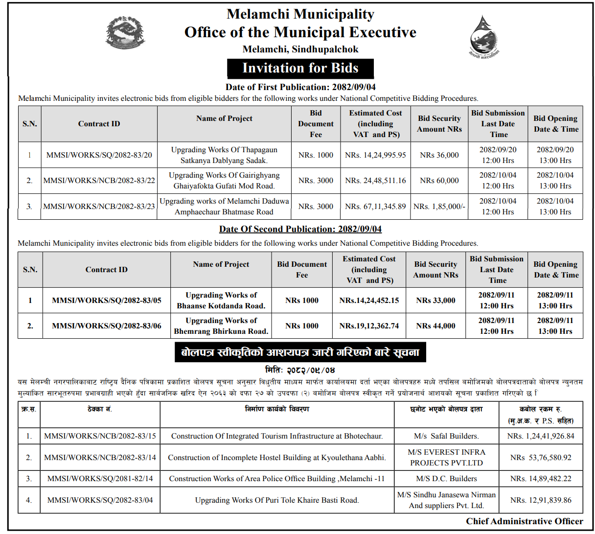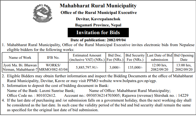 | 10 | Melamchi Municipality Office, Bagmati Province, SINDHUPALCHOK; | Upgrading Works Of Ward Office Majhi Gaun Road, Melamchi -10 | 18/12/2025 | PPMO | 02/01/2026 | Click Here | |