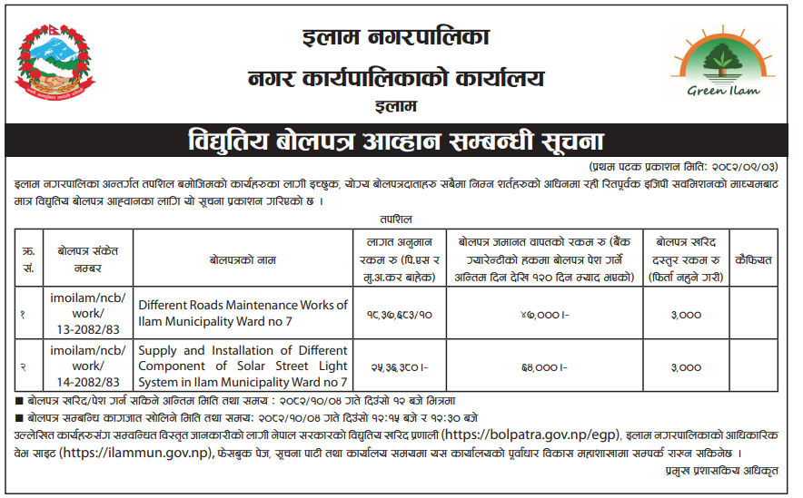 | 115 | Ilam Municipality, Office of the Municipal Executive, Ilam, Koshi Province, Nepal | Supply and Installation of Different Component of Solar Street Light System in Ilam Municipality Ward no 7 | 18/12/2025 | PPMO | 18/01/2026 | Click Here | |