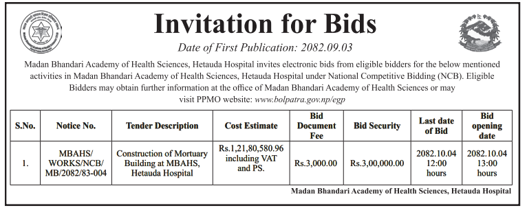 | 119 | Madan Bhandari Academy of Health Sciences | Construction of Mortuary Building at MBAHS, Hetauda Hospital | 18/12/2025 | PPMO | 18/01/2026 | Click Here | |