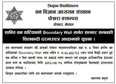 | 1 | Community Forest Study Center | Construction of Boundary wall within the premises of Community Forests Study Center, Thokarpa, Sindhupalchowk | 18/12/2025 | PPMO | 02/01/2026 | Click Here | |