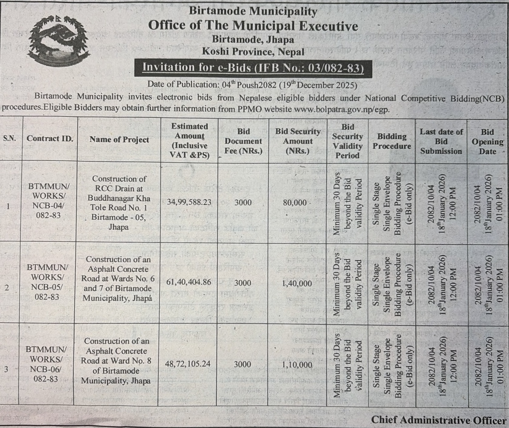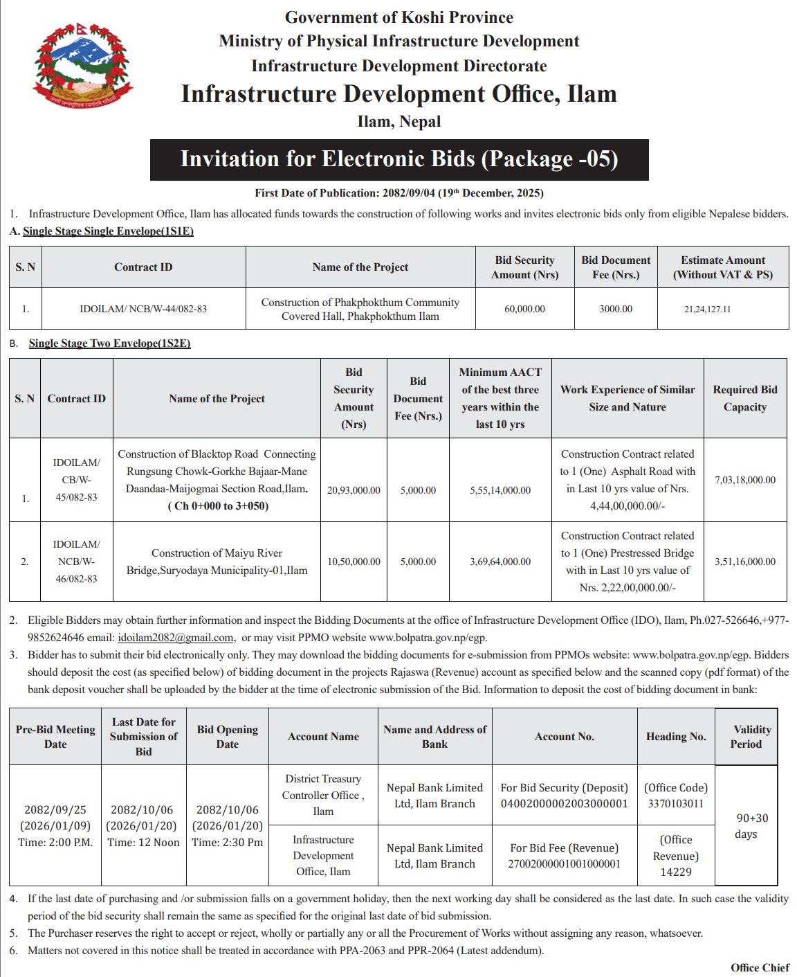 | 106 | Infrastructure Development Office,Illam | Upgrading Deurali Lamidanda Tobhang Road at Mangsebung -1, Ilam | 18/12/2025 | PPMO | 18/01/2026 | Click Here | |
