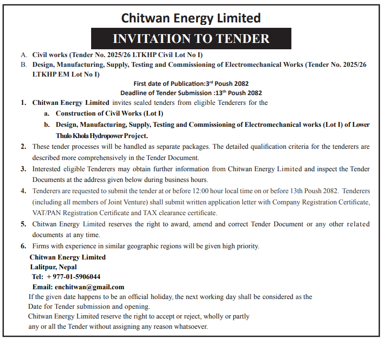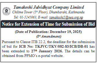 | 13 | NEA, Devighat Hydropower Station | PCC road for D.G room and Sanitary works | 18/12/2025 | PPMO | 02/01/2026 | Click Here | |