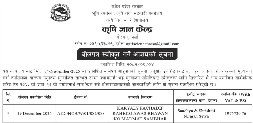 निर्माण सम्बन्धी प्रकाशित सम्पूर्ण ठेक्का टेन्डर तथा बोलपत्र सुचनाहरु प्रदेश अनुसार 19/12/2025 (Friday)
