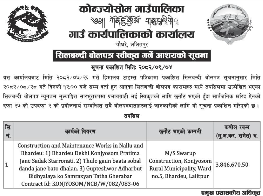 | 147 | Office of Rural Municipal Executive Konjyosom , Lalitpur | Construction of Dalchoki Khelmaidan, Konjyosom-3, Dalchoki | 18/12/2025 | PPMO | 16/01/2026 | Click Here | |