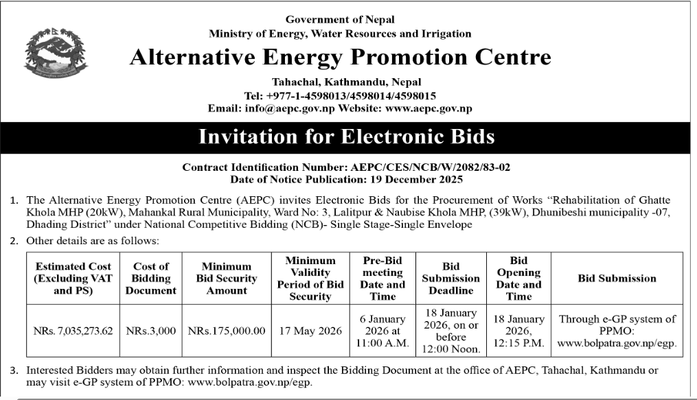 | 14 | NEA, Devighat Hydropower Station | Maintenance of Guest House Room | 18/12/2025 | PPMO | 02/01/2026 | Click Here | |