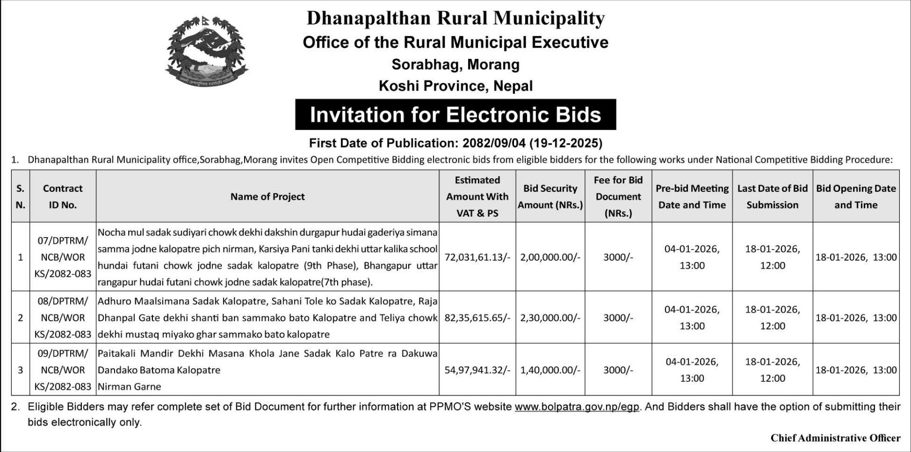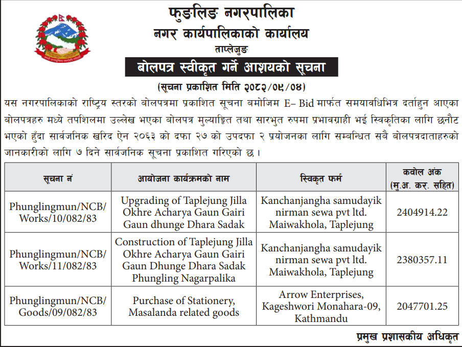 | 127 | Phakphokthum Rural Municipality, Illam | Construction Of Rabi Amchok Sadak Phase-2 | 18/12/2025 | PPMO | 18/01/2026 | Click Here | |