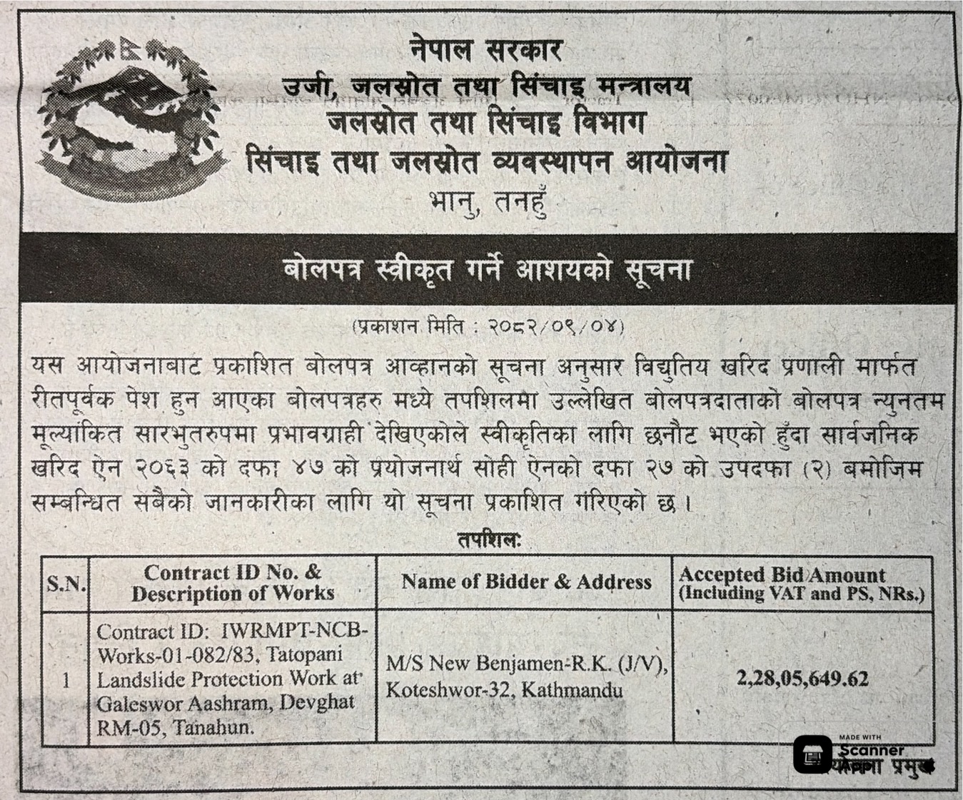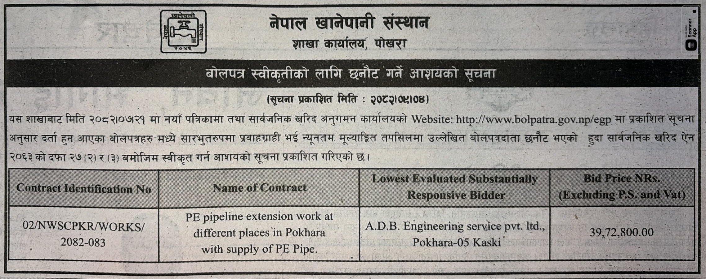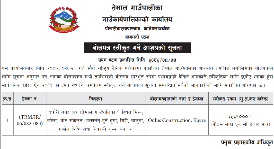 प्रदेश ४ मा प्रकाशित निर्माण सम्बन्धी बोलपत्र तथा आशयका सुचनाहरु