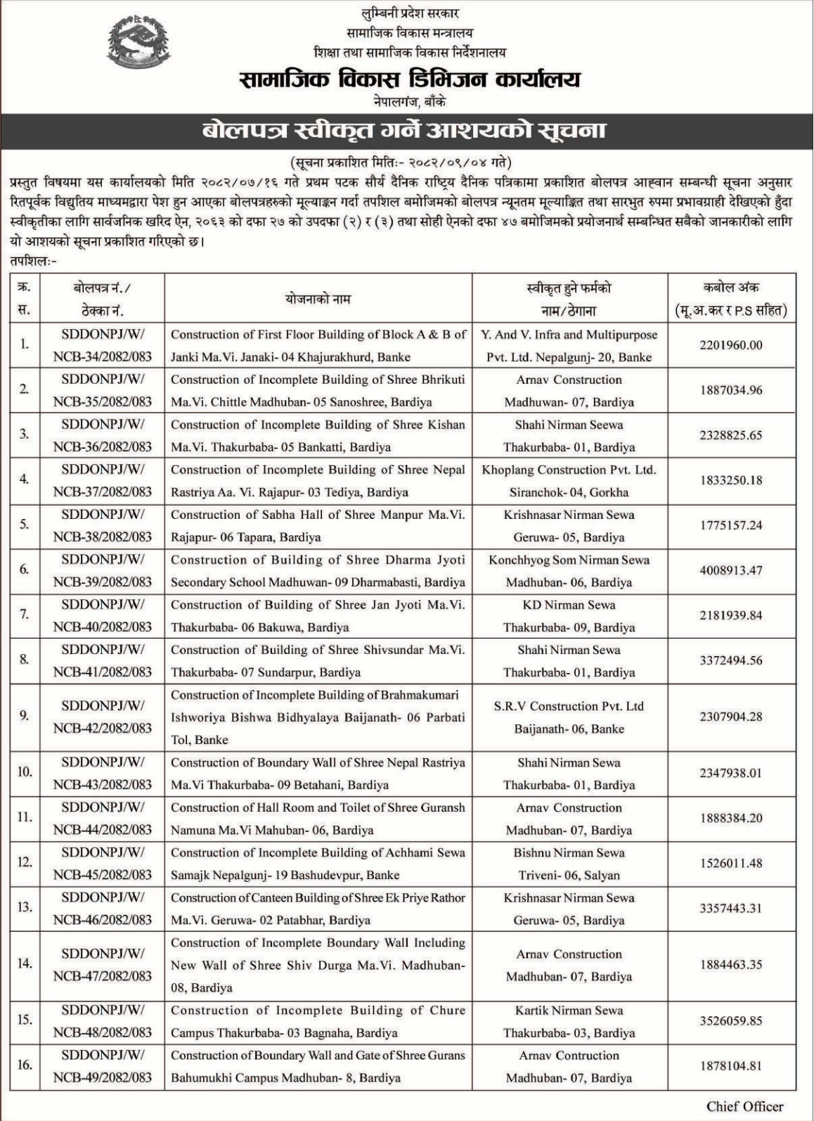 | 22 | social development office Kanchanpur | Shree Baljyoti Ma.Vi. Incomplate Two Room School Building Construction , Bedkot Municipality-04,Kanchanpur | 18/12/2025 | PPMO | 02/01/2026 | Click Here | |