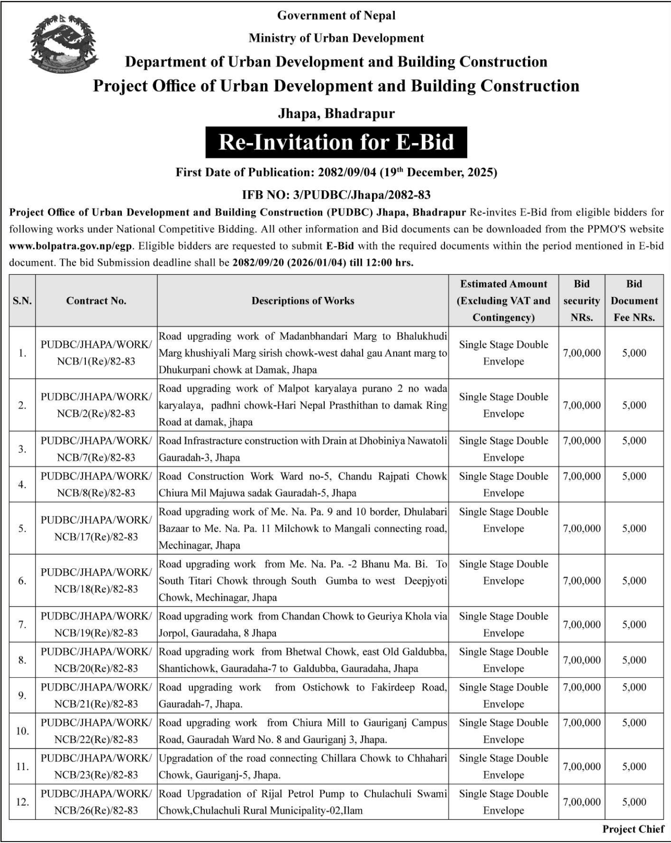 | 135 | Urban Development and Building Office, Makawanpur | Asphalt Concreting and drain works at various road in Rapti Na.Pa. ward no. 5 and 8, Chitwan | 18/12/2025 | PPMO | 18/01/2026 | Click Here | |