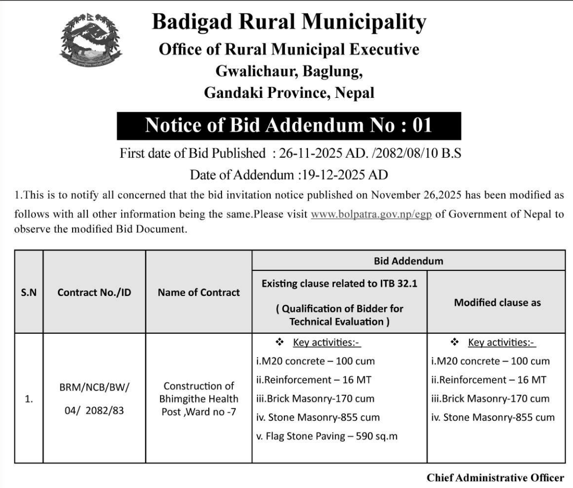 | 151 | Chhatradev Rural Municipality | Pauwa Health Post-Taktola Motorable Road, Chhatradev-02, Arghakhanchi | 18/12/2025 | PPMO | 07/01/2026 | Click Here | |