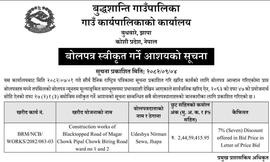 | 163 | Road Infrastructure Development Office, Kapilvastu | Taulihawa Rajapani Babhani Kholako Bandh Najik Pakki Pul Dekhi Thulo Khet Hudai Sadhukuti Samma ra So Bandh Dekhi Paschim Gangoliya Tilakhawa Sadak Samma Starunnati Sahit Kalopatre Banganga 03 Kapilvastu | 18/12/2025 | PPMO | 02/01/2026 | Click Here | |
