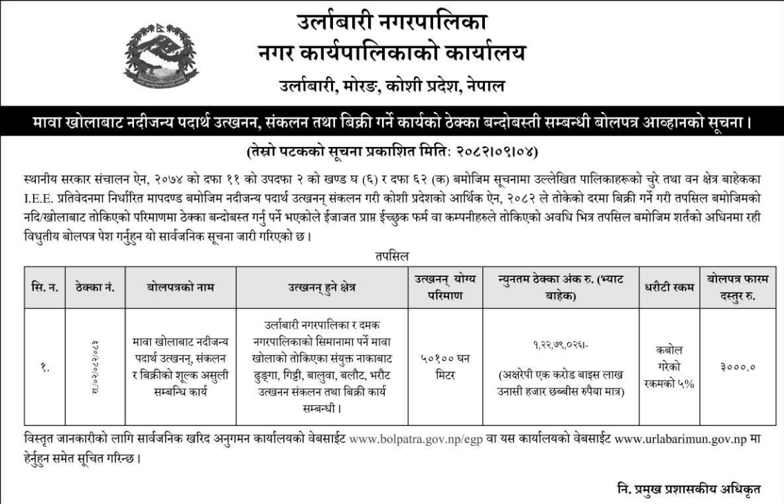 | 149 | Chhatradev Rural Municipality | Extraction of River Bed Materials from Saurya Khola | 18/12/2025 | PPMO | 07/01/2026 | Click Here | |