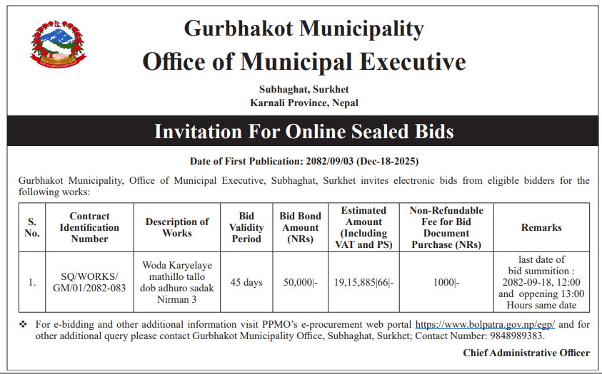| 26 | Gurbhakot Municipality, Surthet | Woda karyalaya mathillo,tallo doba road construction works. | 18/12/2025 | PPMO | 02/01/2026 | Click Here | |