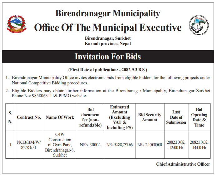 | 148 | Birendranagar Municipality, Surkhet | C4W Construction of Gym Park, Birendranagar-8, Surkhet | 18/12/2025 | PPMO | 16/01/2026 | Click Here | |