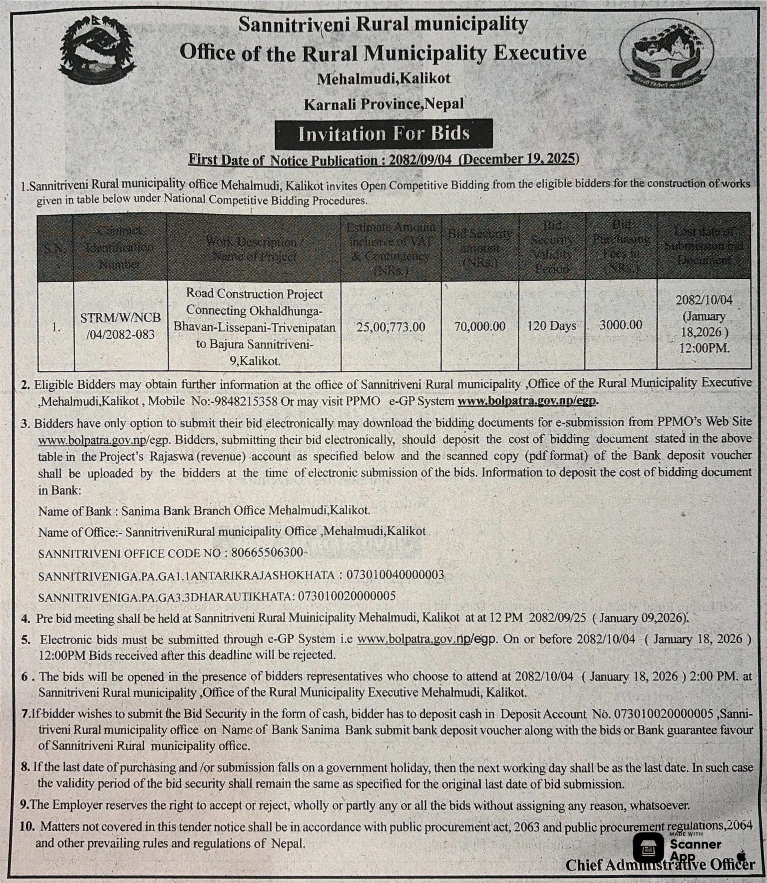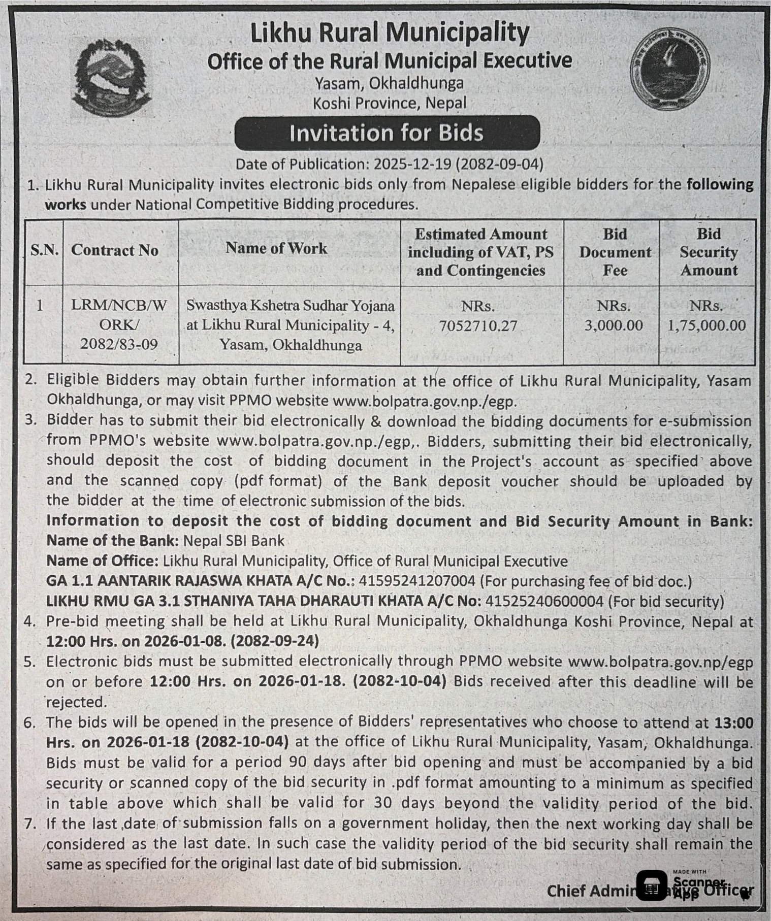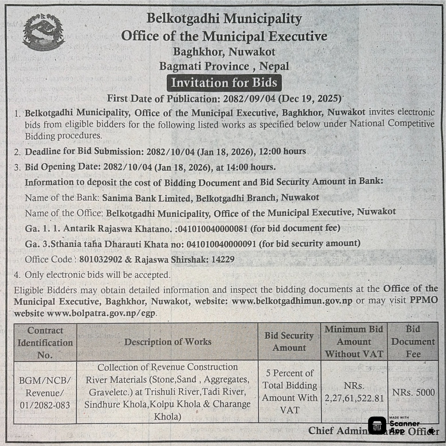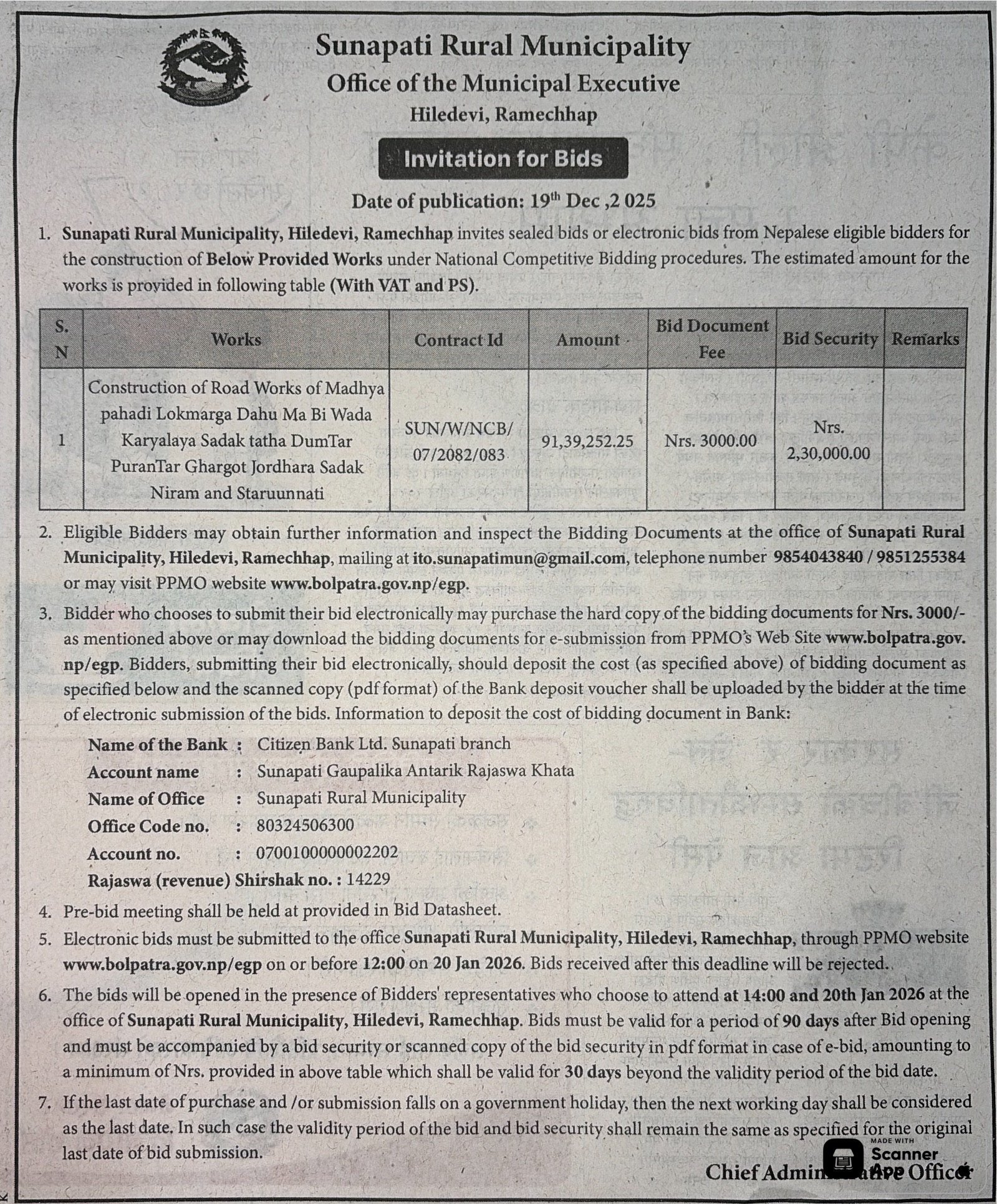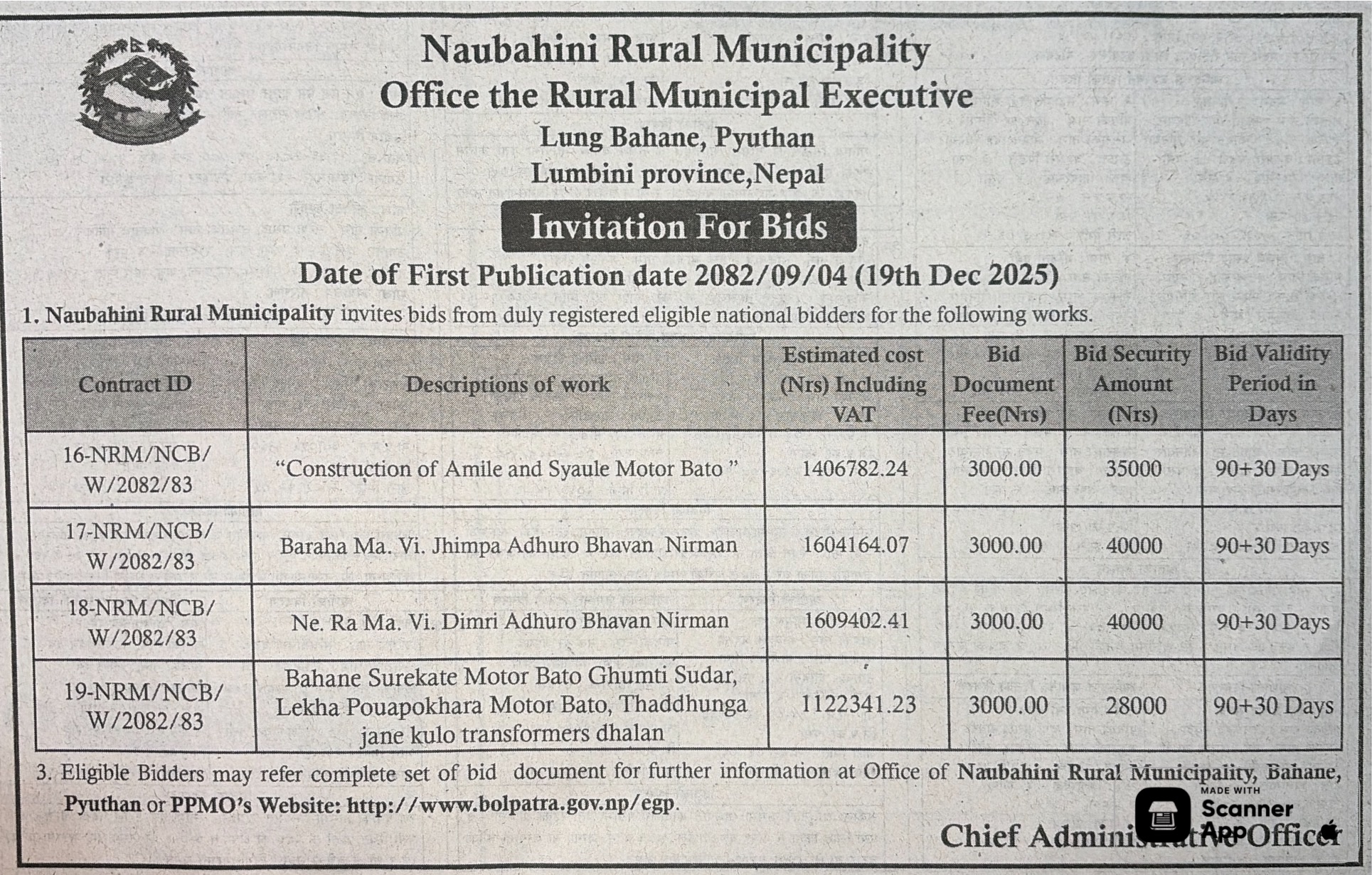 | 17 | Office of Madane Rural Municipality | Janasewa Aa Bi Purwadhar Nirman Yeojana | 18/12/2025 | PPMO | 02/01/2026 | Click Here | |