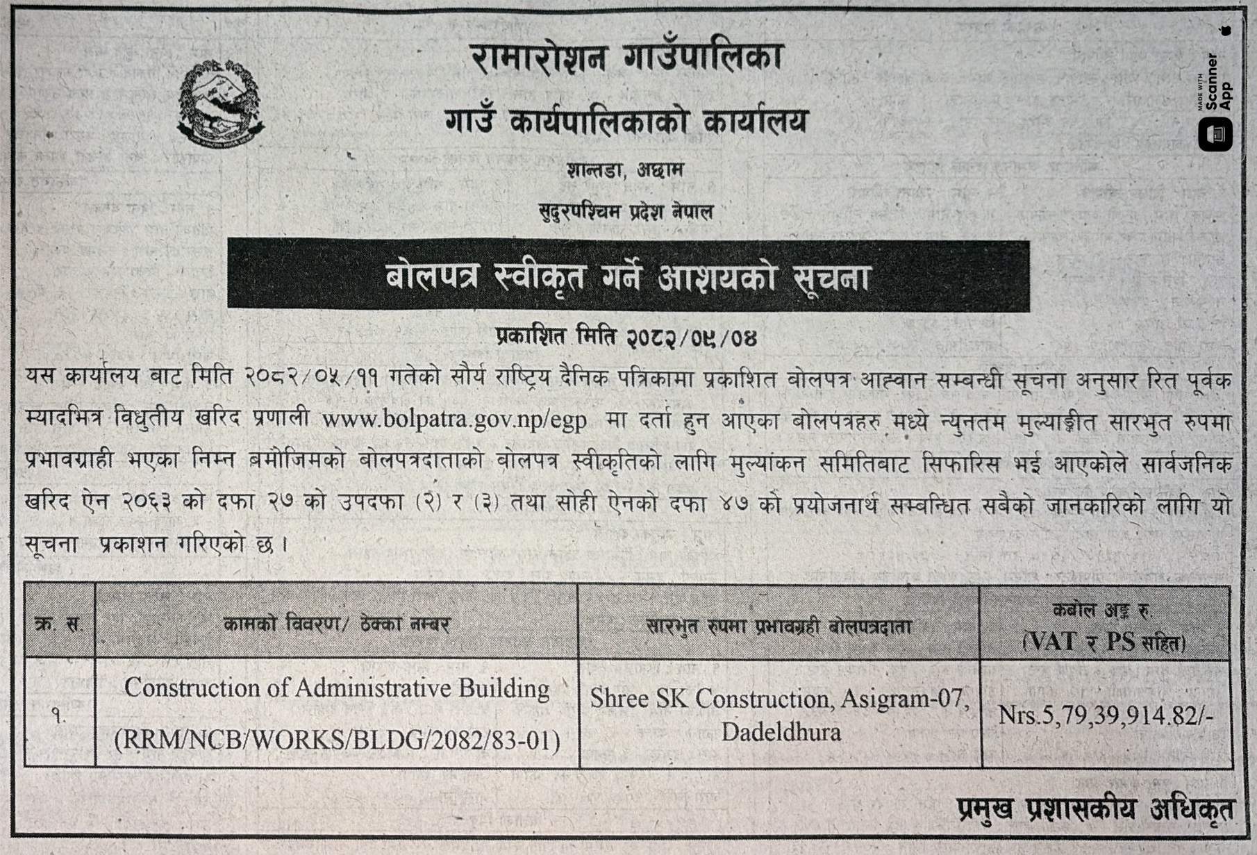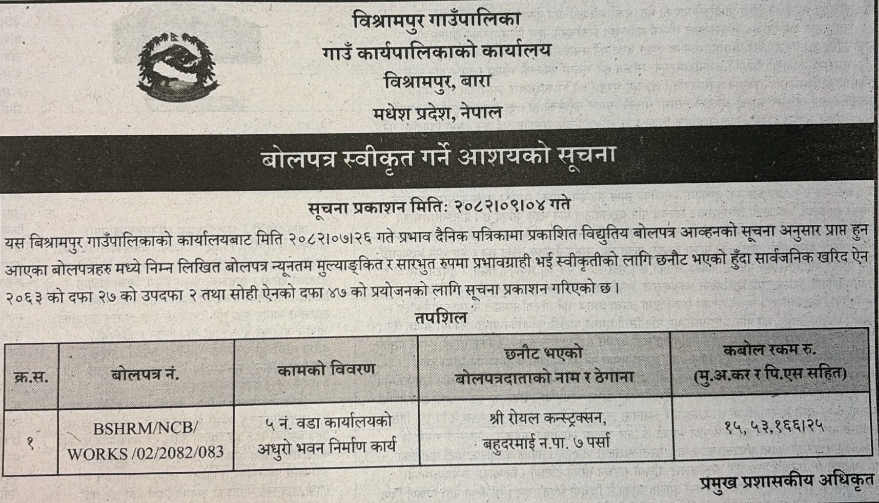 प्रदेश ५ मा प्रकाशित निर्माण सम्बन्धी बोलपत्र तथा आशयका सुचनाहरु