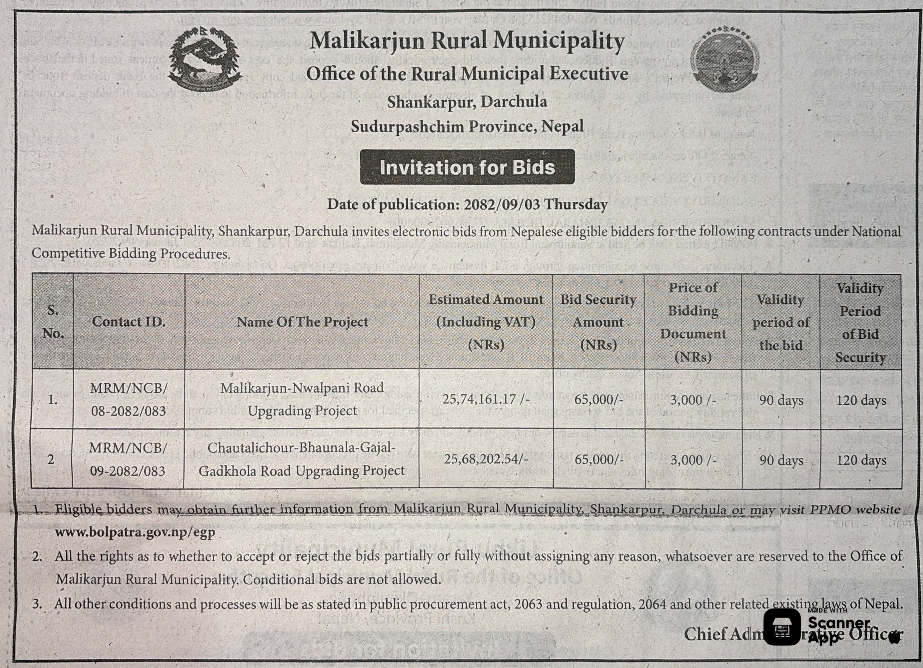 | 200 | Gaumukhi Rural Municipality Office, Lumbini Province, PYUTHAN; | Construction Of Different Types of Road. | 18/12/2025 | PPMO | 02/01/2026 | Click Here | |