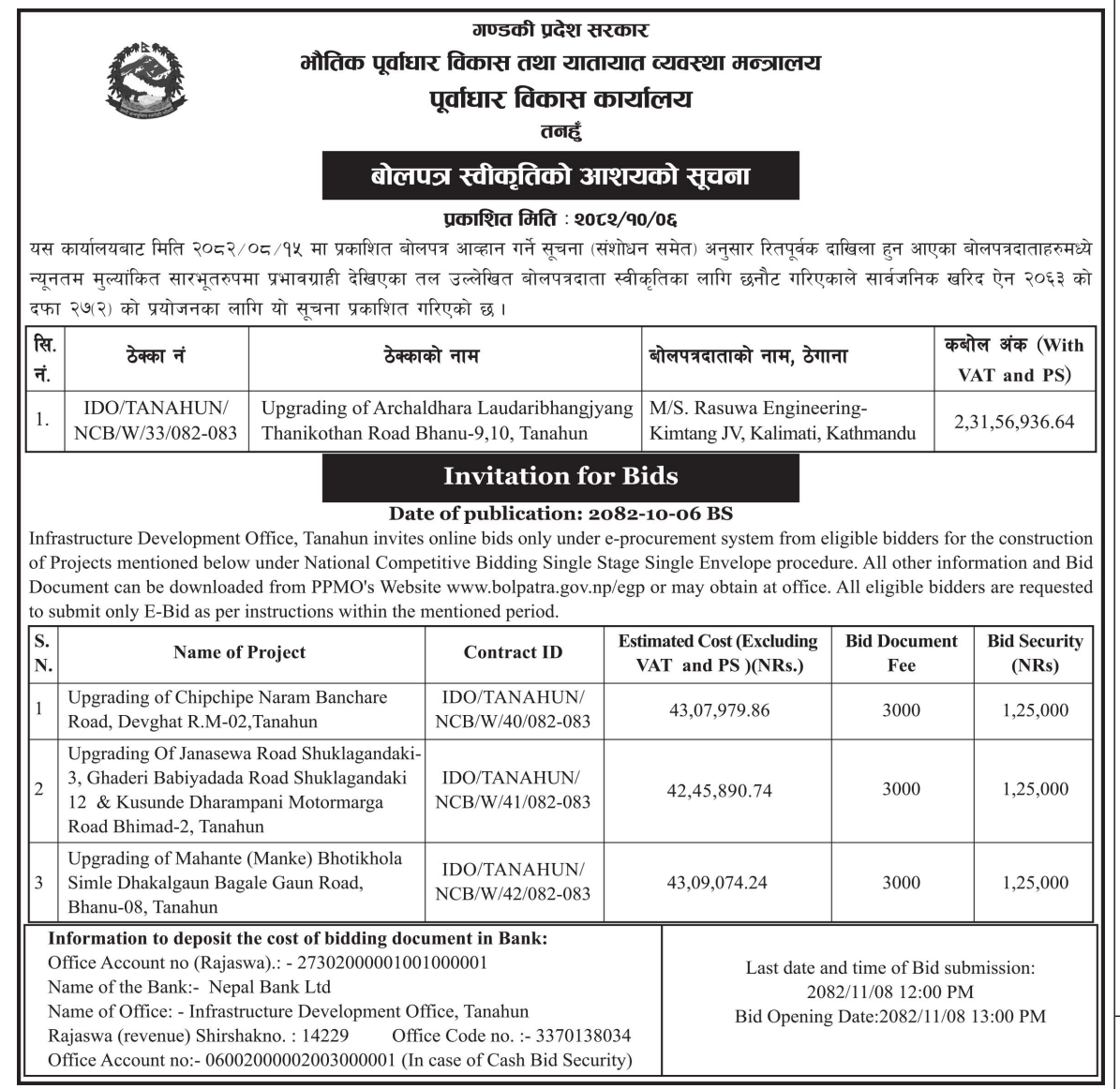 | 5 | Chaubise Rural Municipality Office, Koshi Province, DHANKUTA; | JARUWA KHOLA PAUWA KRISHI SADAK STARUNATTI | 19/01/2026 | PPMO | 04/02/2026 | Click Here | |