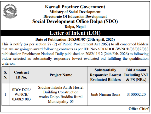 | 7 | Chatrakot Rural Municipality Office, Lumbini Province, GULMI; | Covering of Shringa Covered Hall | 19/04/2026 | PPMO | 04/05/2026 | Click Here | |