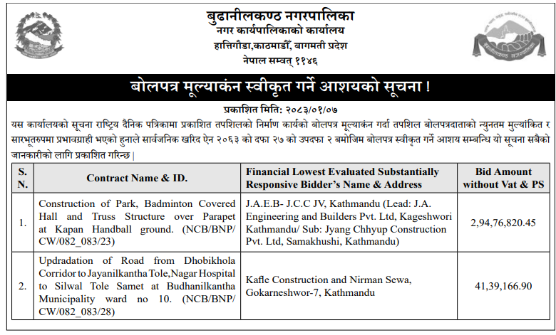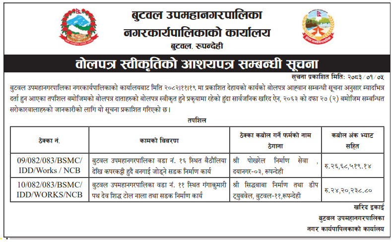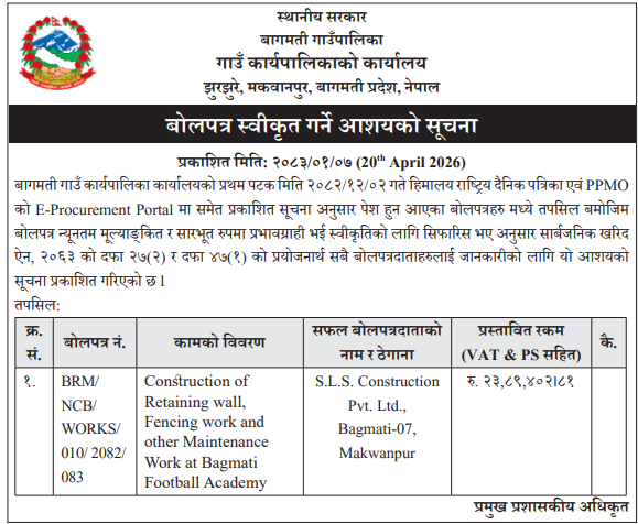 बोलपत्र स्विकृत ; Bid Award (Construction only) 20/04/2026 (Monday)