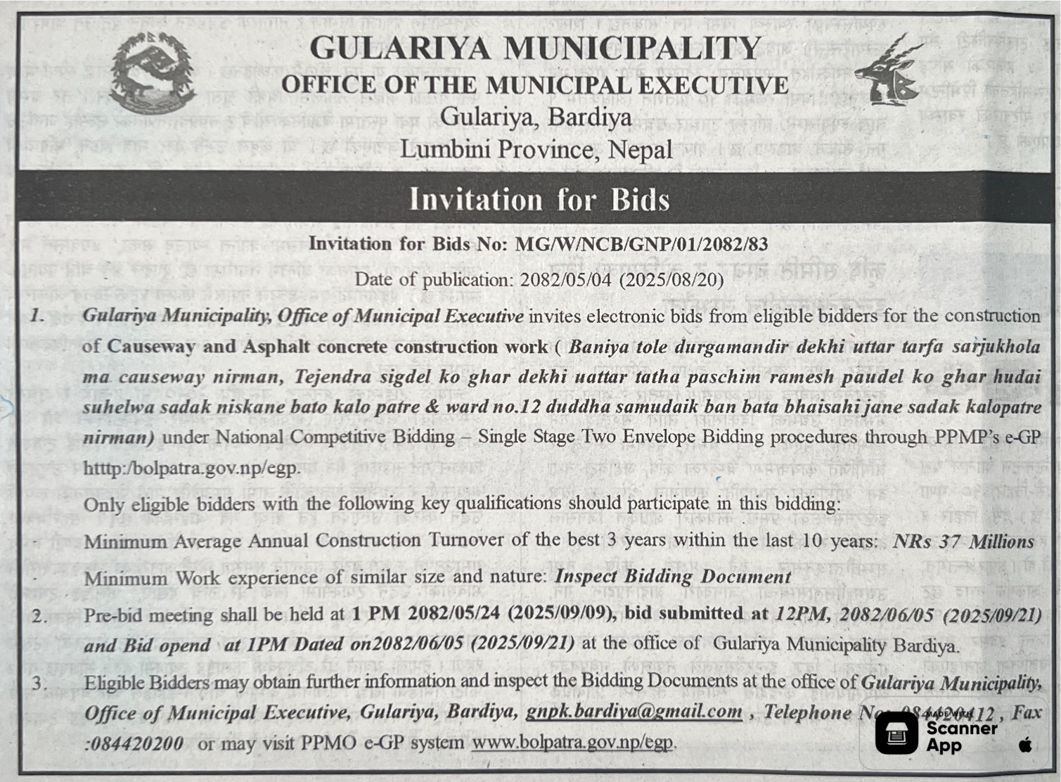 | 6 | Madhyabindu Municipality | construction of Ashphalt Concrete works on Madhyabindu-ward number 3(Gurau chock to Kawasoti 17,Nandabhauju Marga,Durgamandir-Golden Height-Ratanpur) | 19/08/2025 | PPMO | 18/09/2025 | Click Here | |