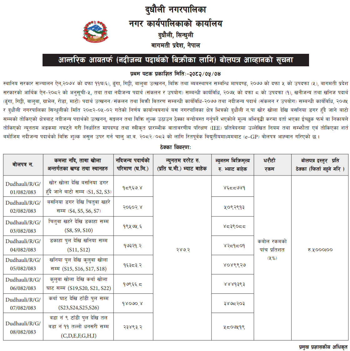 | 59 | Baiteshwor Rural Municipality | Collection of Internal Revenue from the sales of river based materials from the left bank of Tamakoshi River Sector B(Maryang Bagar,Sati Bagar and Bimire Bagar) | 19/08/2025 | PPMO | 18/09/2025 | Click Here | |